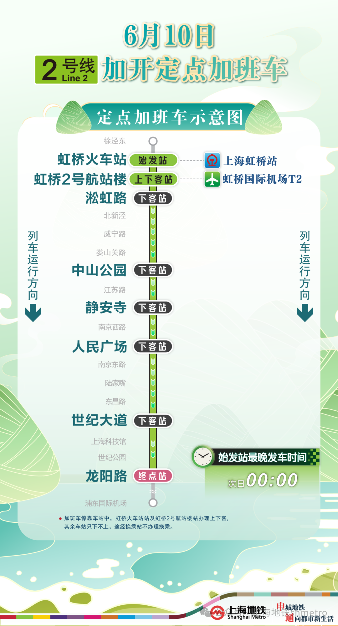 2号线虹桥火车站站往龙阳路站方向加班车,沿途停靠虹桥火车站站、虹桥2号航站楼站、淞虹路站、中山公园站、静安寺站、人民广场站、世纪大道站、龙阳路站(终到站),其余车站跳停。停靠车站中,虹桥火车站站(始发站),虹桥2号航站楼站办理上下客,其余车站只下不上,途经换乘站不办理换乘。