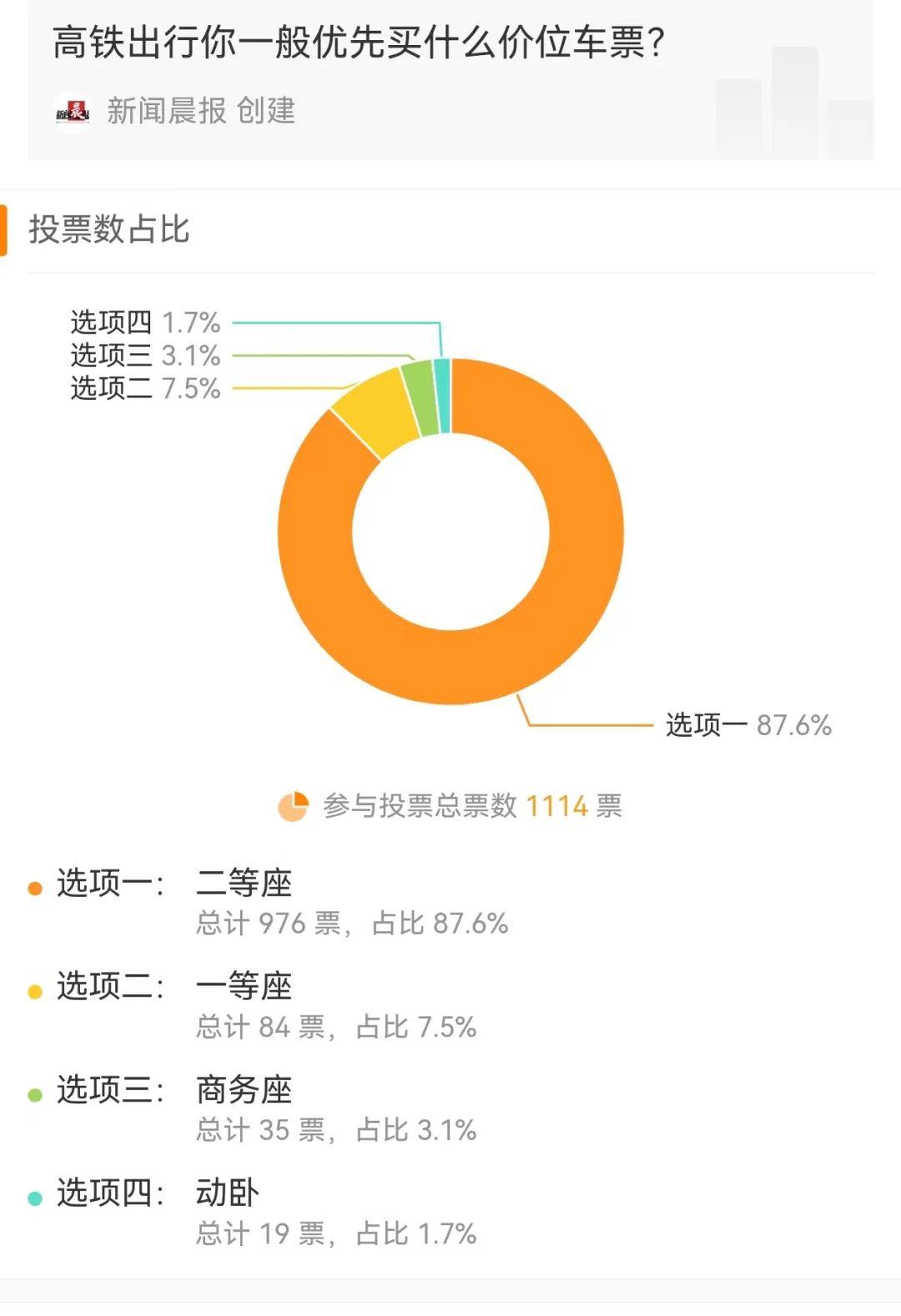 而在新闻晨报微博发起的投票“高铁出行你一般优先买什么价位车票?”中,87.6%的网友都投给了二等座;7.5%的网友投票一等座,3.1%的网友投票给商务座。
