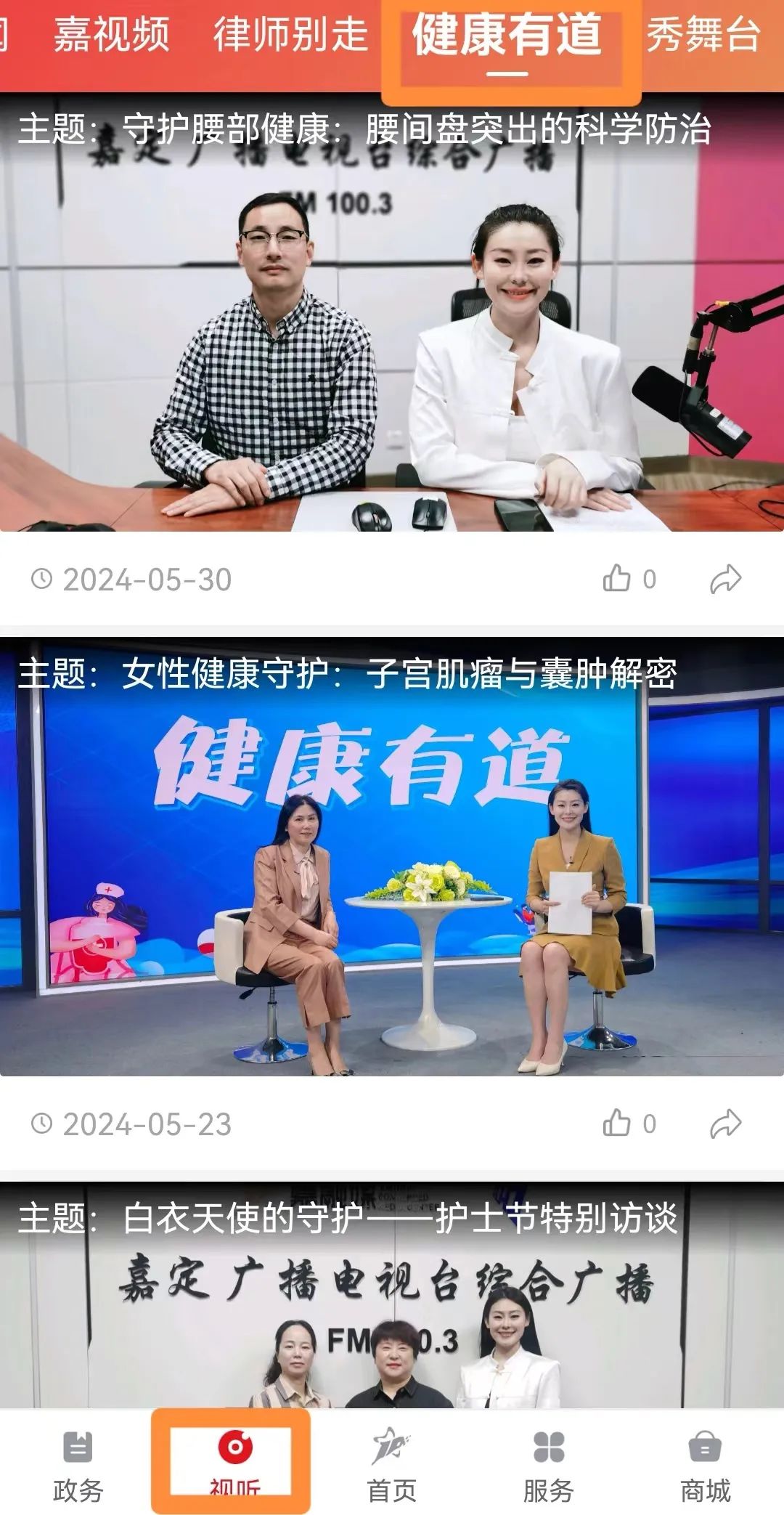 在“上海嘉定”APP首页中,点击“视听”按钮找到“健康有道”,可以回看往期节目。