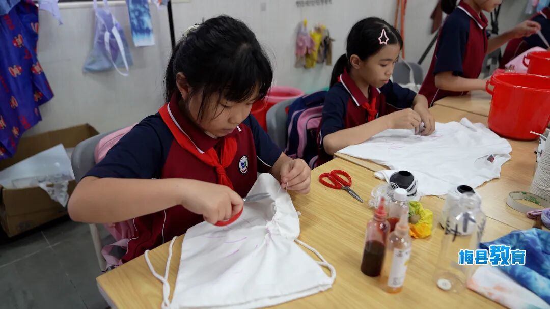在梅县区扶大宪梓中心小学的课堂里,一堂别开生面的扎染课正在进行。在老师的悉心指导下,学生们聚精会神地投入其中,体验着扎染艺术的独特魅力。