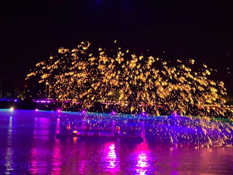 随后,龙舟表演赛、飞龙在天、传统徽剧与现代歌舞结合的创新节目一一上演。晚会分为《梦幻新安》《龙舟竞渡》《焰遇徽州》《昱见鱼龙》《时尚徽韵》《溢彩昱城》六个篇章。《龙舟竞渡》展现了屯溪赛龙舟的悠久历史文化,更生动演绎了龙舟竞渡的潇洒豪情。原创歌舞表演《焰遇徽州》将古徽州的历史底蕴演绎的淋漓尽致,古韵徽州,一眼千年。《昱见鱼龙》用一只只从江面上穿梭而来的“徽州大鱼”,带大家领略了中式浪漫。《时尚徽韵》将传统戏曲与现代流行歌曲、街舞融合在一起,激荡起别样火花。临近尾声,江上打铁花映照万千星辰,火树银花竞相绽放,如同银河倒挂天空,与天上的飞龙相映衬,绚丽多彩的黄山画卷,在新安山水中徐徐展开。