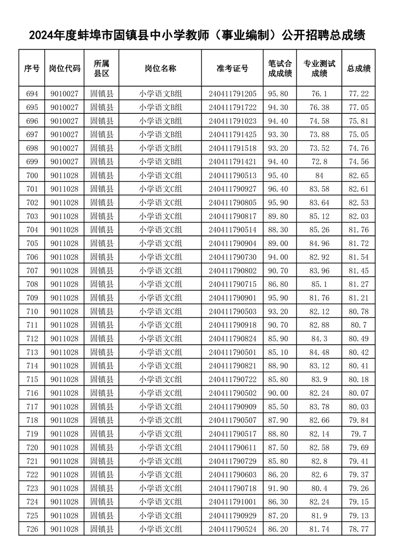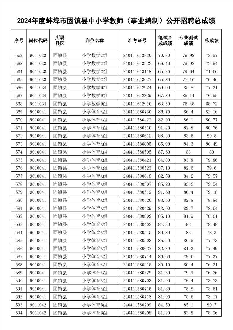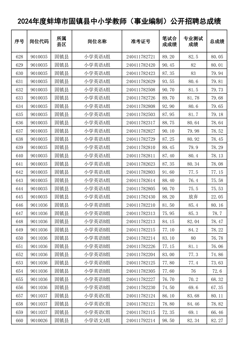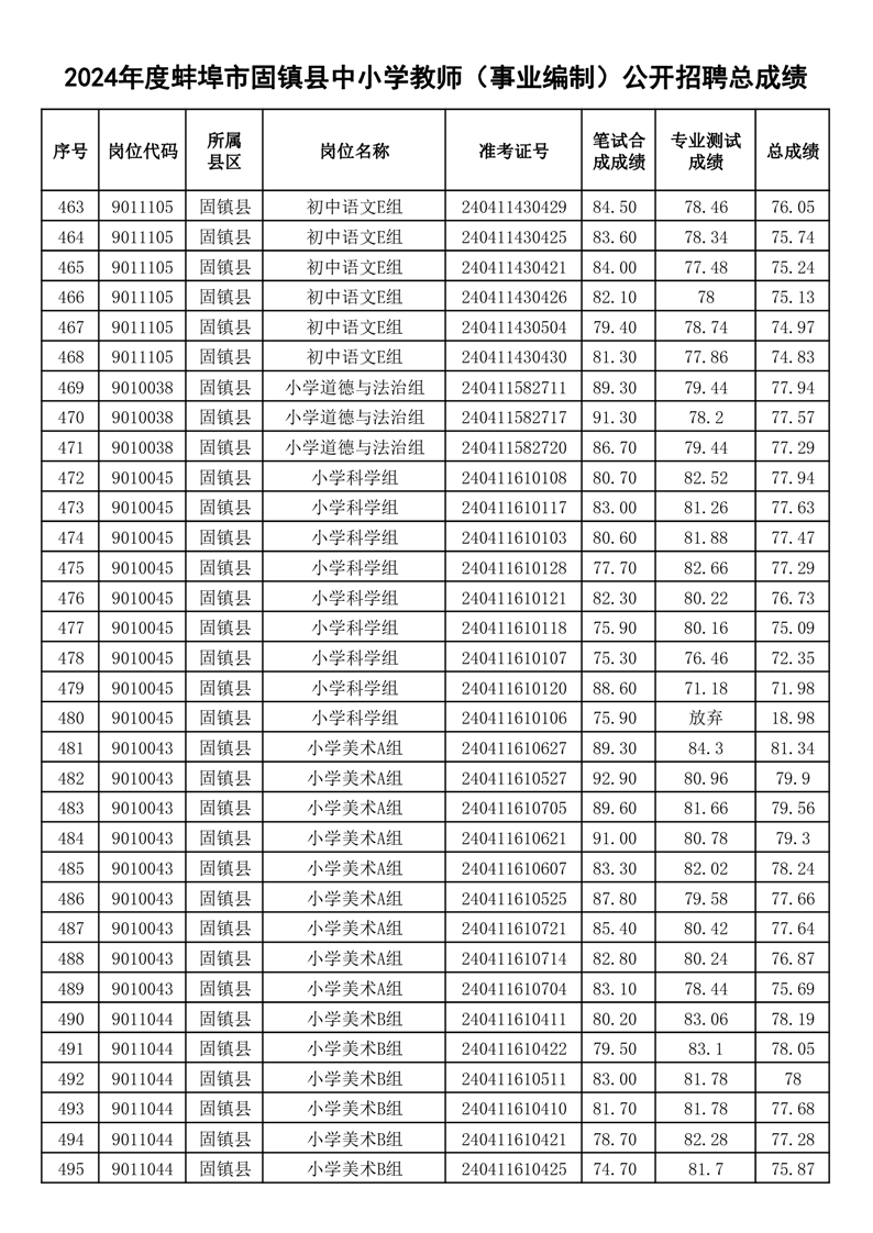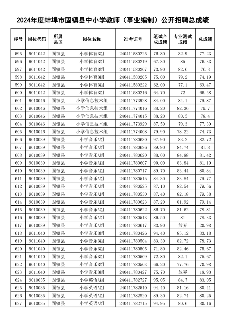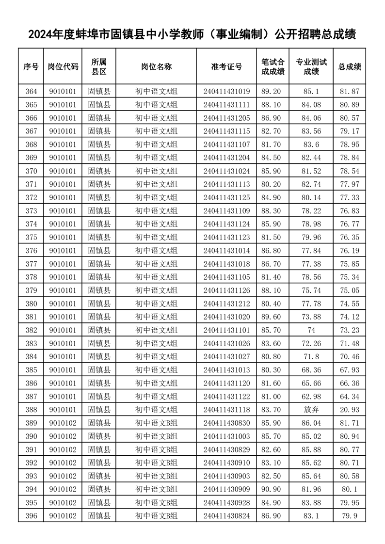 2024年度蚌埠市固镇县中小学教师(事业编制)公开招聘总成绩