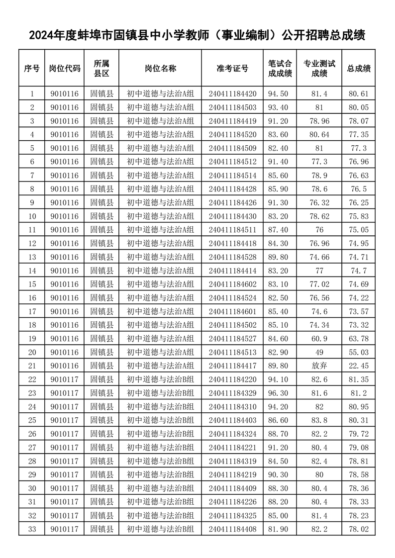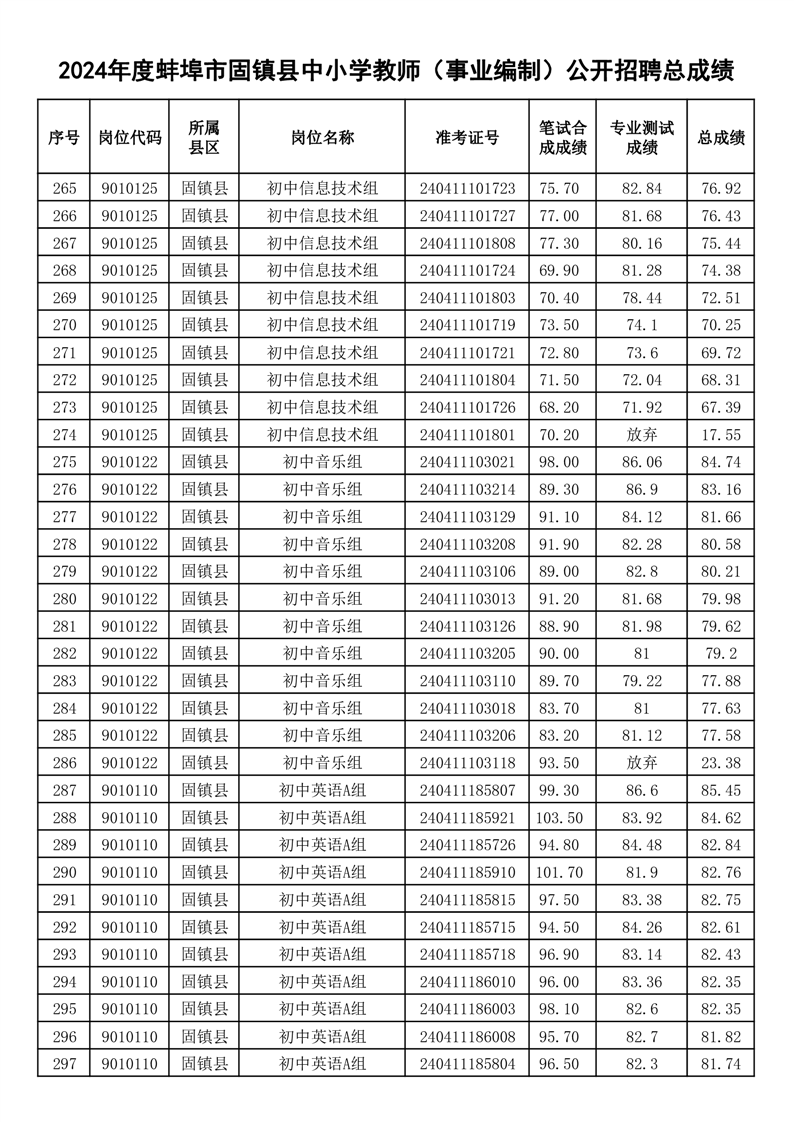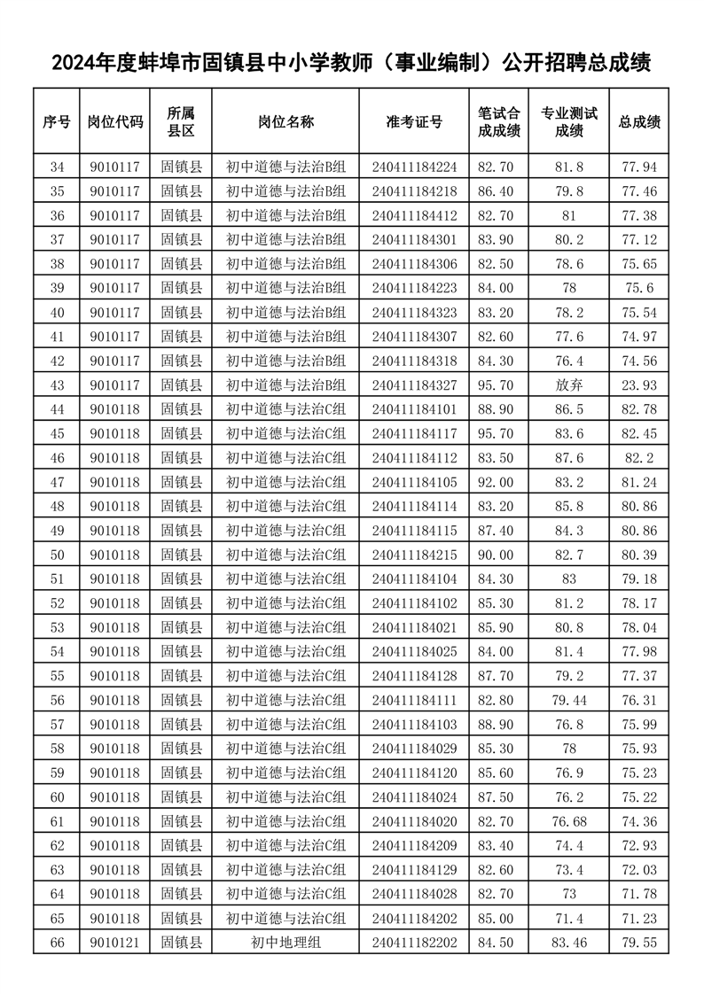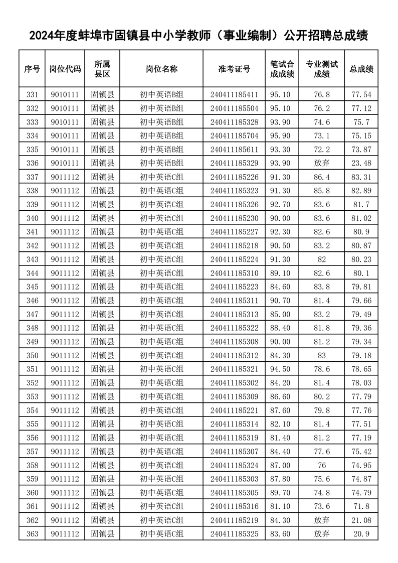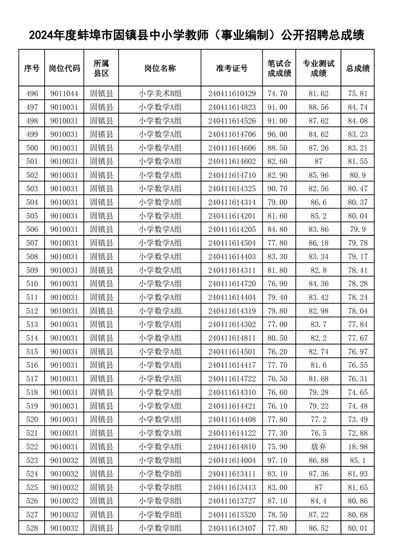 2024年度蚌埠市固镇县中小学教师(事业编制)公开招聘总成绩