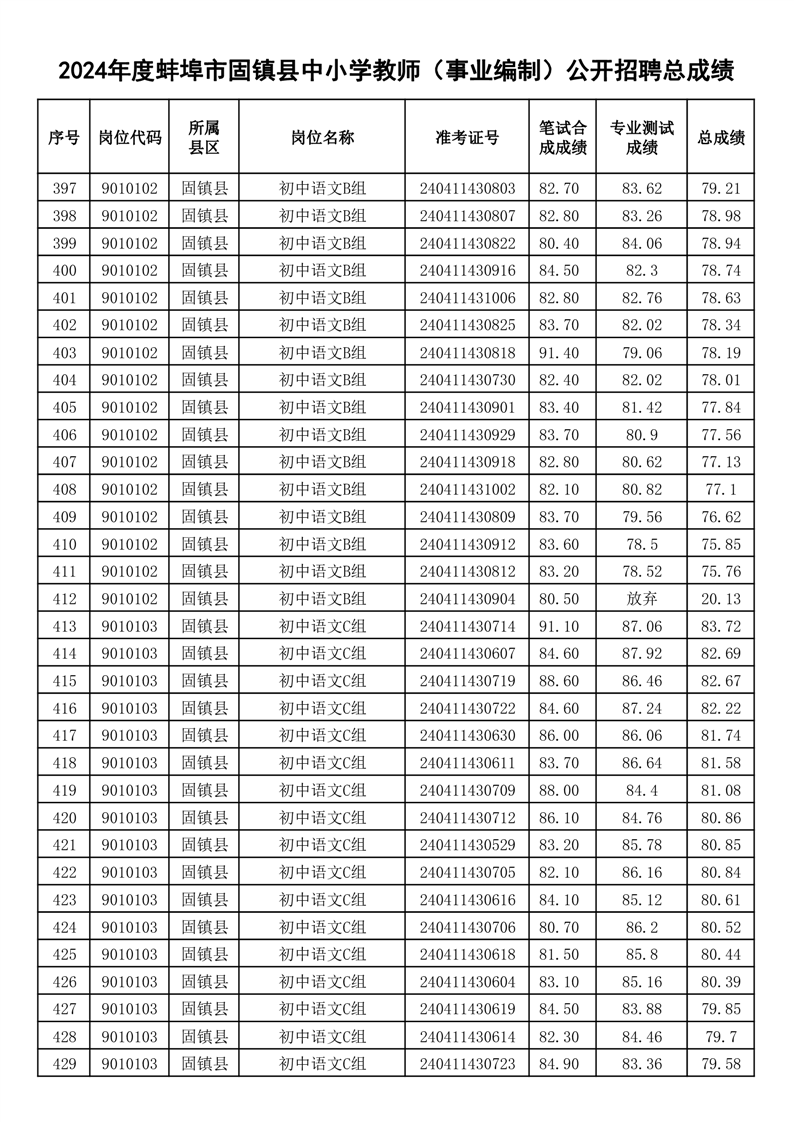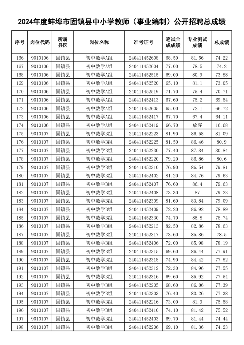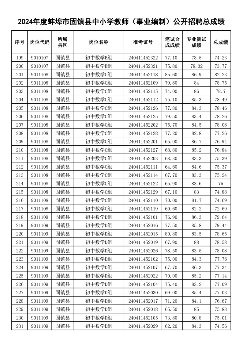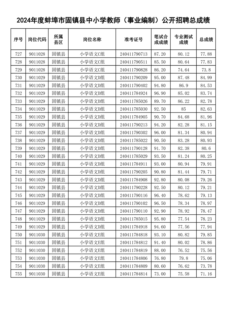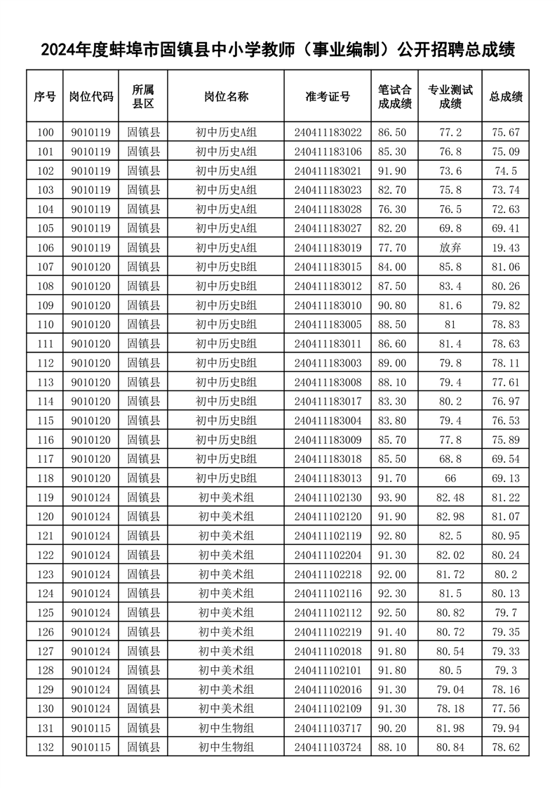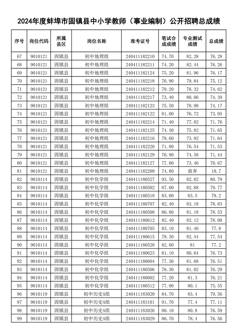 2024年度蚌埠市固镇县中小学教师(事业编制)公开招聘总成绩