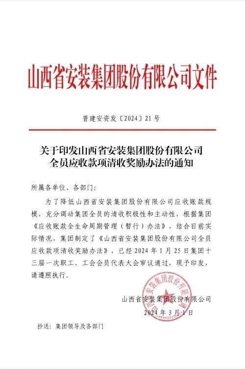 为增强清收力度,提升清收效果,充分调动全员清收工作的主动性和积极性,集团制定《山西省安装集团股份有限公司全员应收款项清收奖励办法》,精准施策、强化督导,确保应收账款清收工作取得实效。