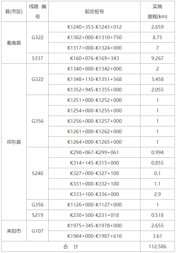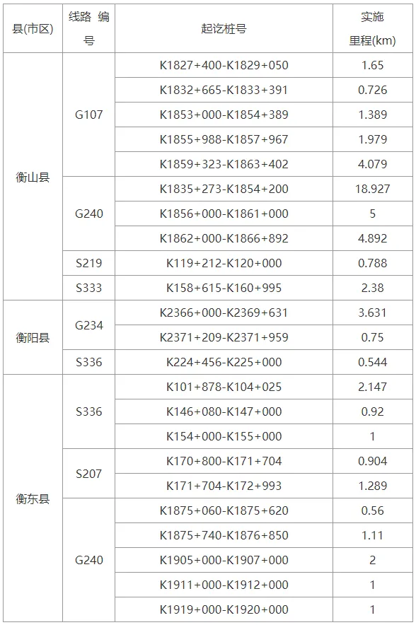 衡阳市2024年国省干线公路大中修 工程占道施工路段表