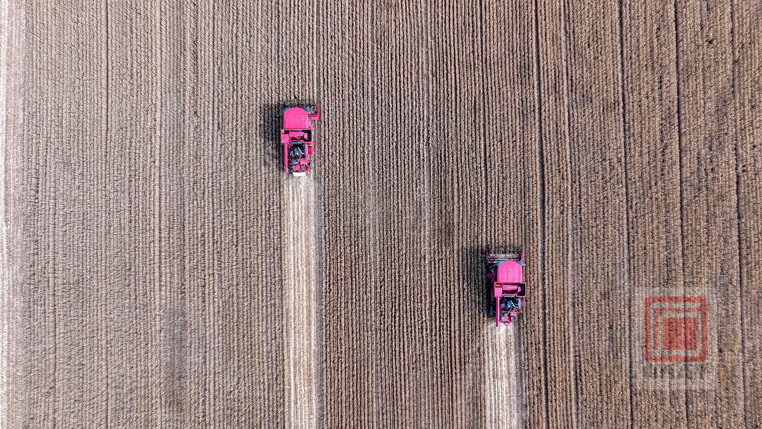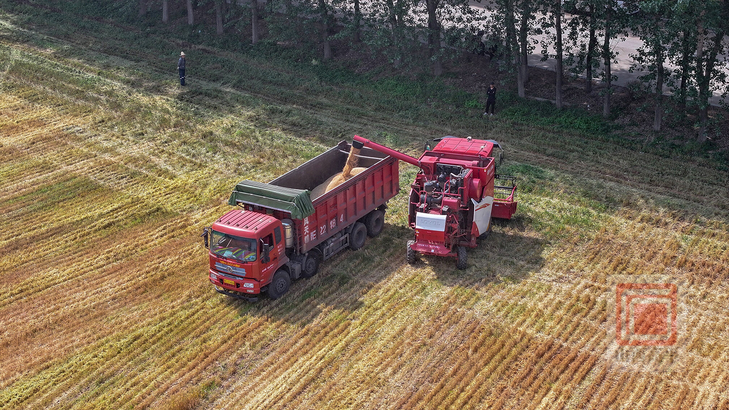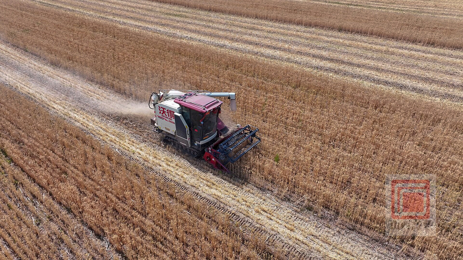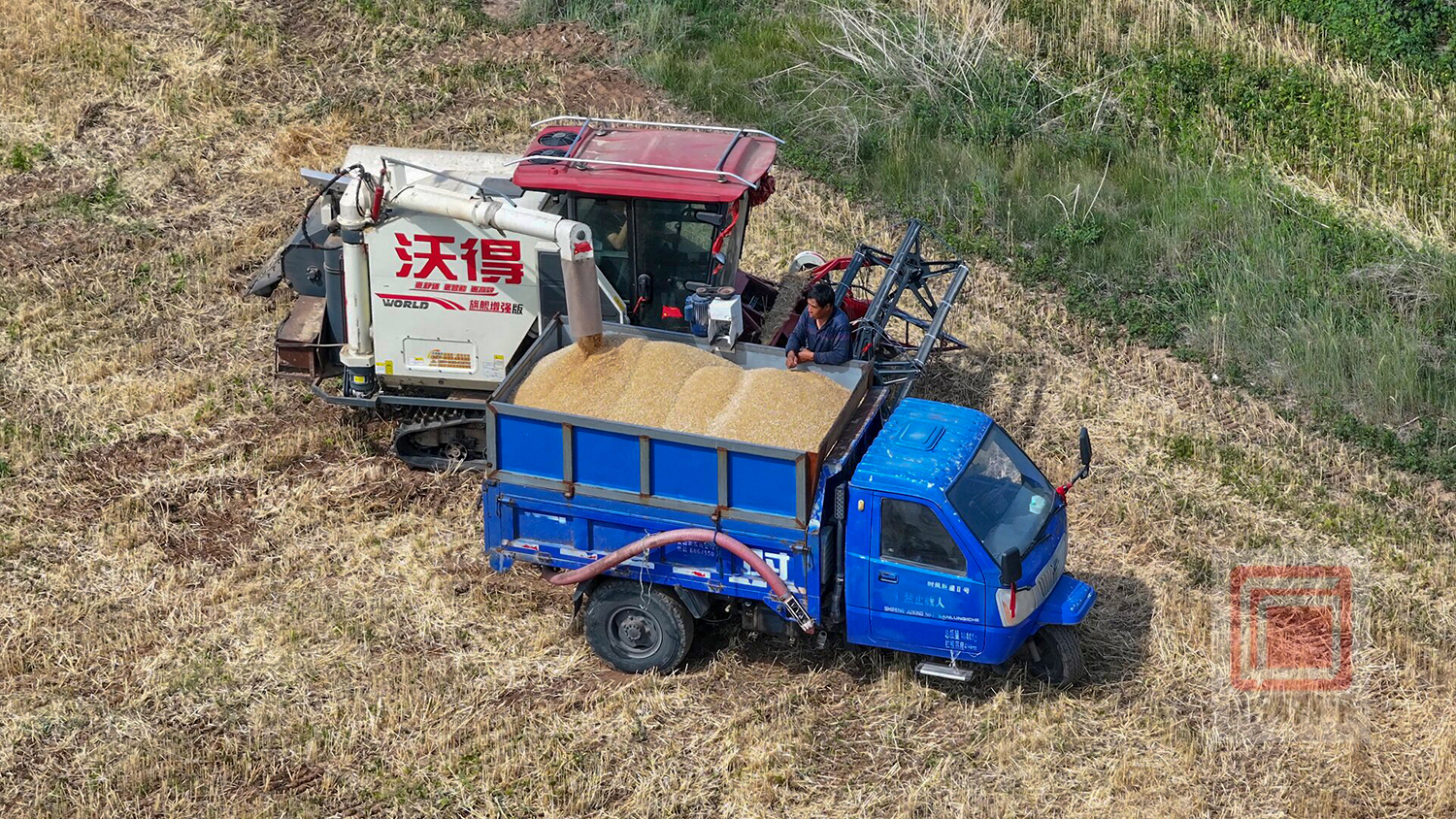 来到小麦机收现场,一望无垠的麦田一片金黄,十余台收割机在滚滚麦浪中来回穿梭,收割、脱粒、麦秆粉碎一气呵成,饱满金黄的麦粒从收获仓倾泻而下,并装上运粮车,呈现出一派丰收喜景。