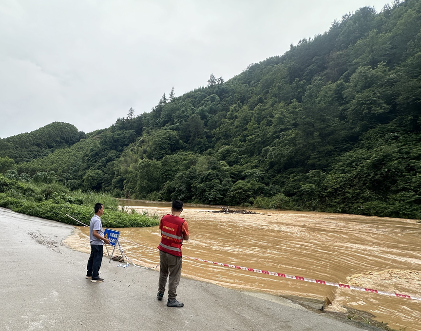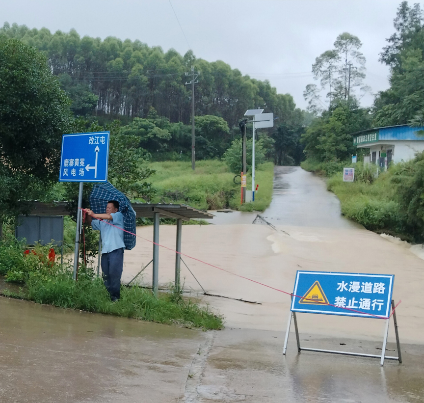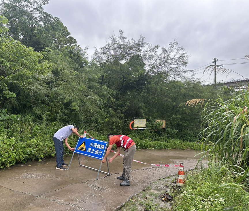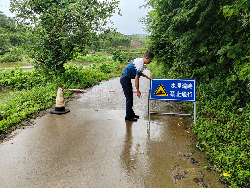 ▲镇村干部、驻村工作队在漫水路段设置警示牌,并安排人员值守,确保群众安全度汛