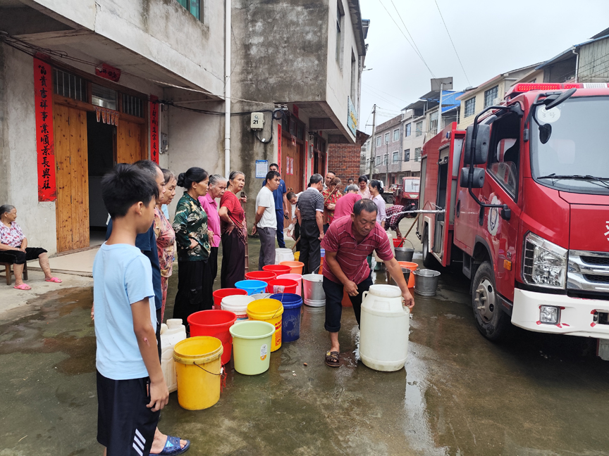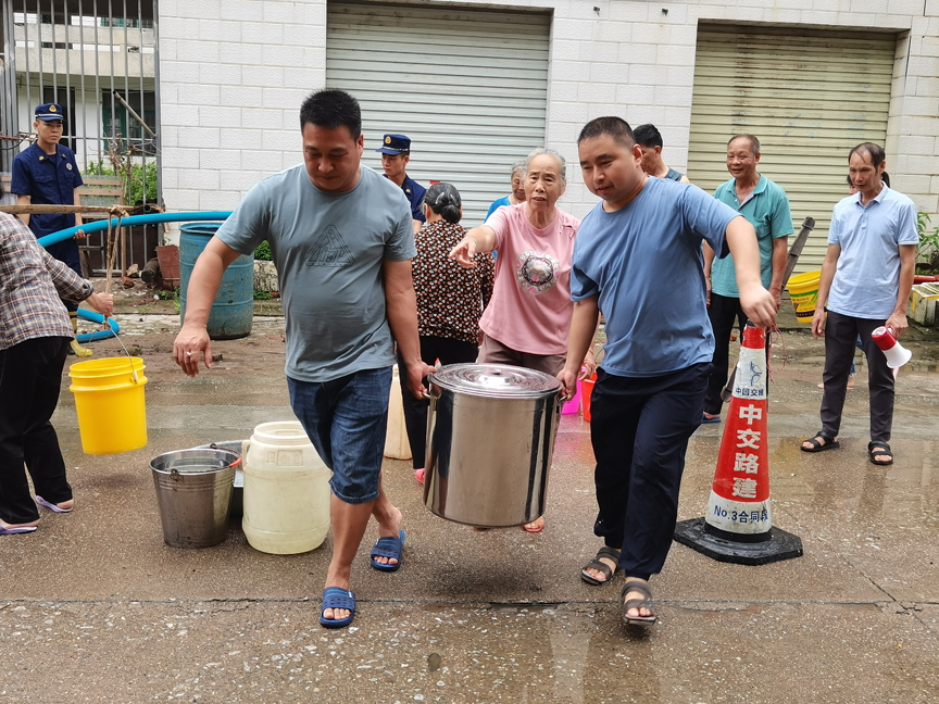 ▲应急救援队伍到黄冕村送水,保障村民在汛期饮水安全