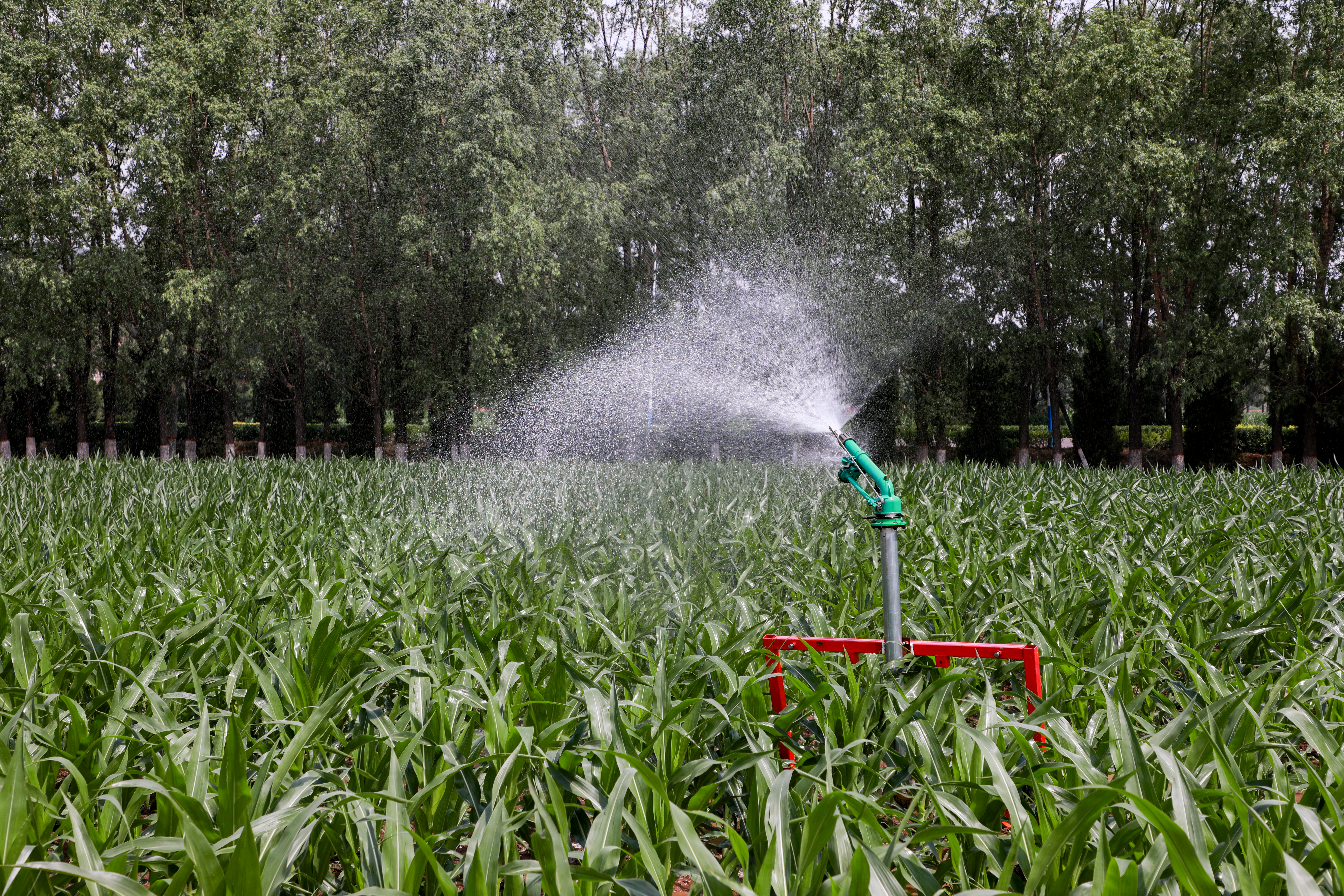 在南城街街道南陈村连片的玉米地,市水务局工作人员正在指导村民,利用许河灌区水源和喷灌设施对农作物进行浇灌。