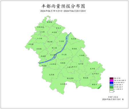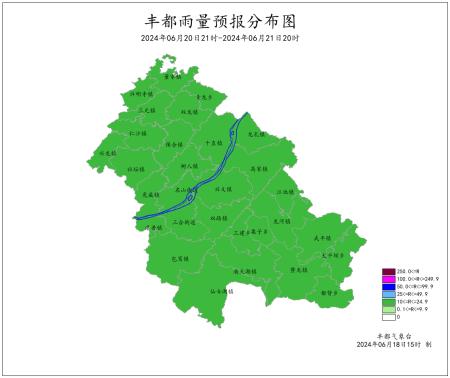 2024年6月17日16时至6月18日16时我县阴天有小雨。最大降雨量为10.5mm(南天湖景区)。最低气温15.2~23.0℃,最高气温17.8~32.6℃。丰都国家基本站最低气温22.1℃,最高气温29.0℃。