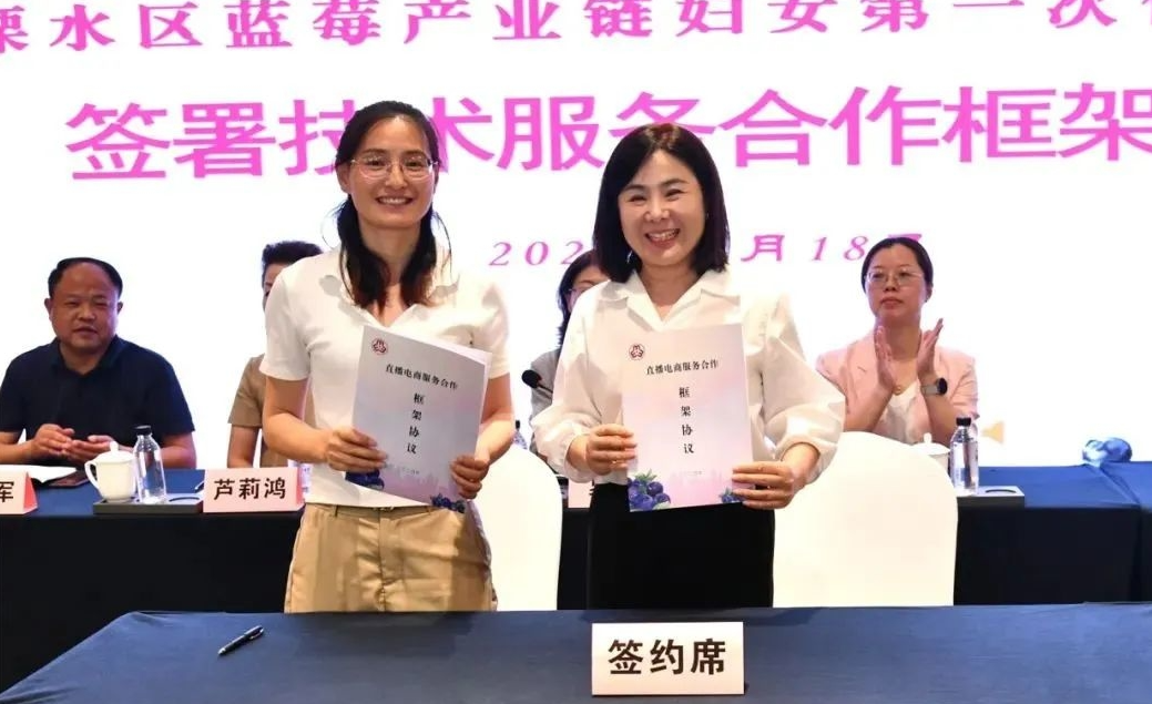会上进行了揭牌仪式;发布了蓝莓产业链妇联2024年工作计划;溧水区蓝莓产业链妇女联合会分别与江苏省中国科学院植物研究所、溧水直播电商产业基地签署了技术服务合作框架协议和直播电商服务合作框架协议。