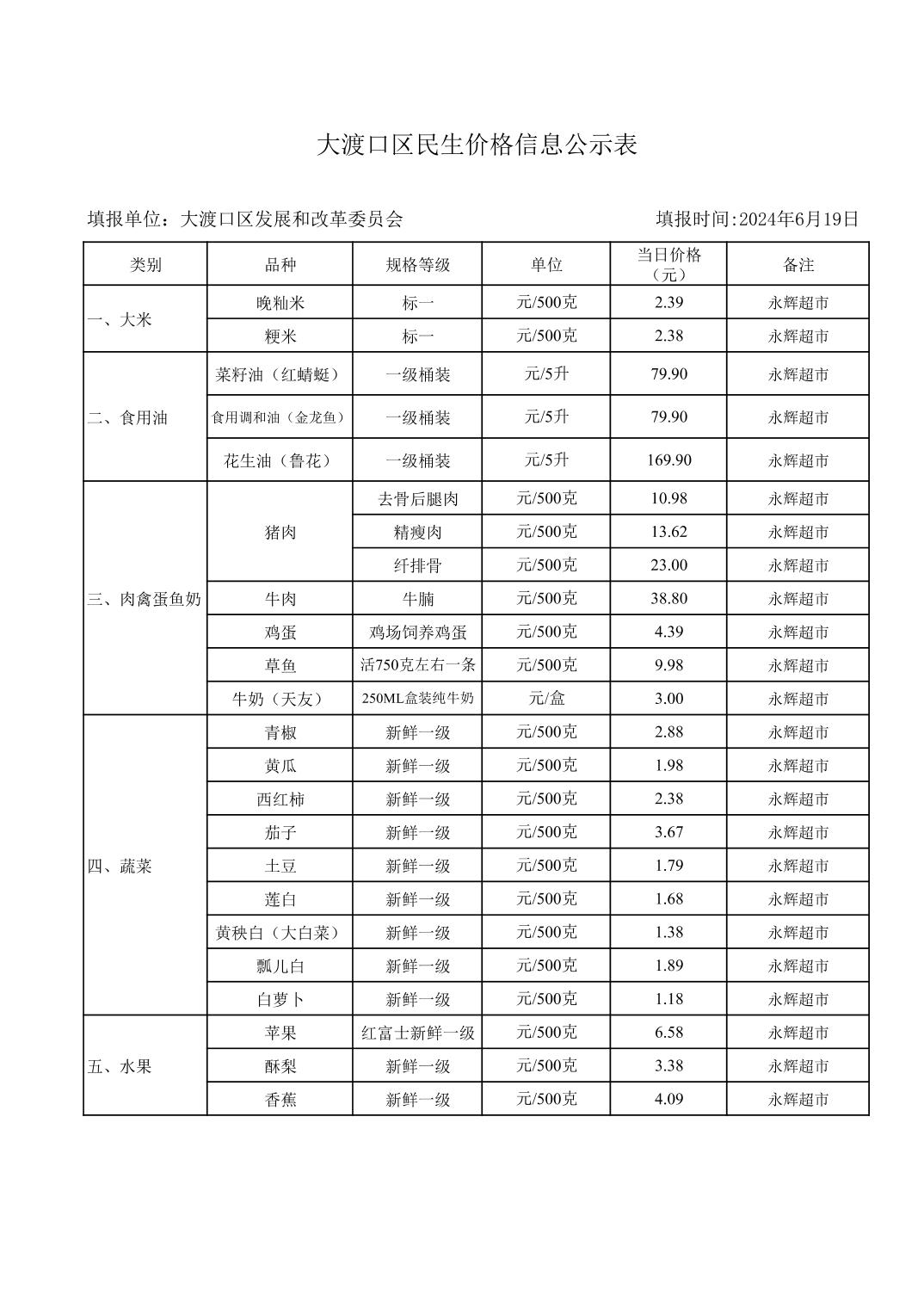 大渡口区民生价格信息公示表 2024-6-19