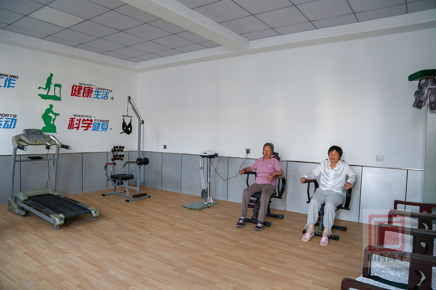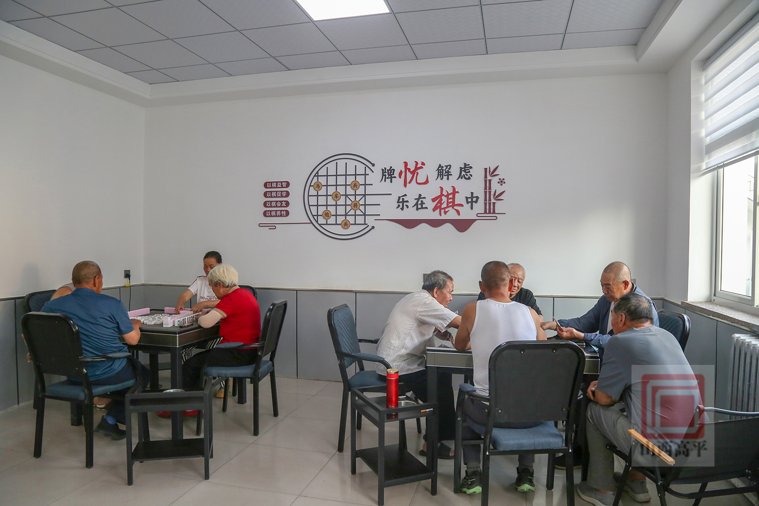 走进活动中心,书香四溢的图书室、宽敞明亮的棋牌室、功能齐全的健身房等一应俱全,三三两两的老人们在这里下棋、锻炼、写字、看书……其乐融融,享受着幸福的晚年生活。