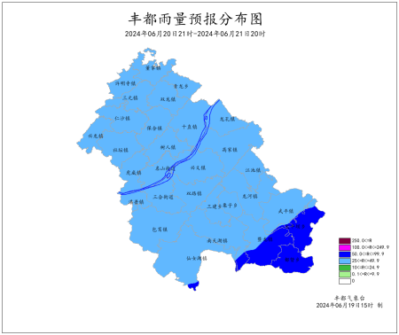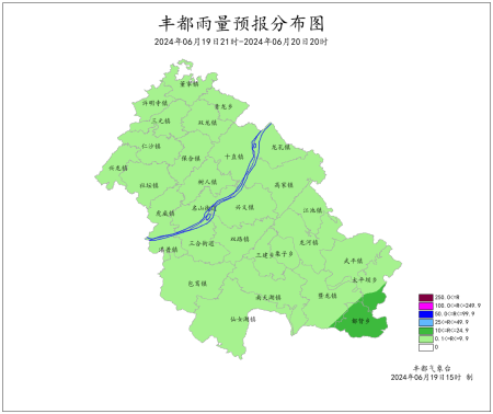 2024年6月18日16时至6月19日16时我县阴天有阵雨。最大降雨量为35.5mm(南天湖景区)。最低气温16.3~23.7℃,最高气温17.9~32.6℃。丰都国家基本站雨量9.6mm,最低气温22.6℃,最高气温27.6℃。