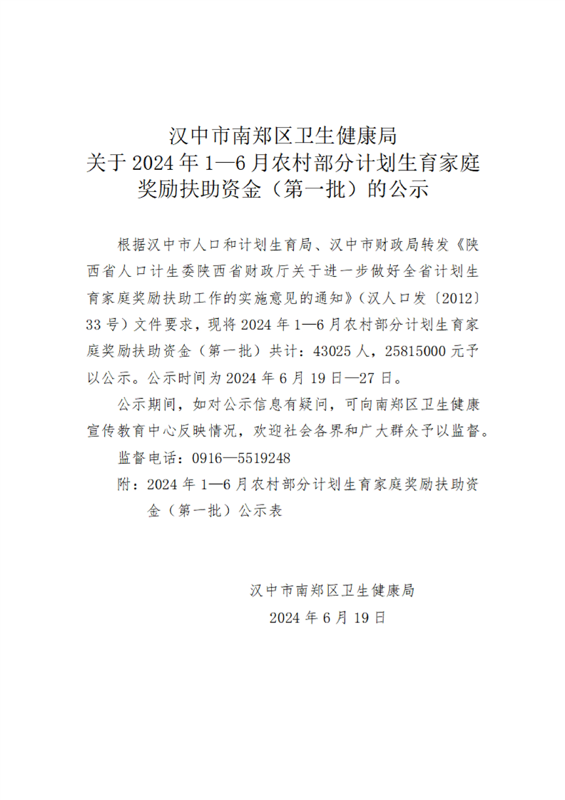 汉中市南郑区卫生健康局关于2024年1—6月农村部分计划生育家庭奖励扶助资金(第一批)的公示