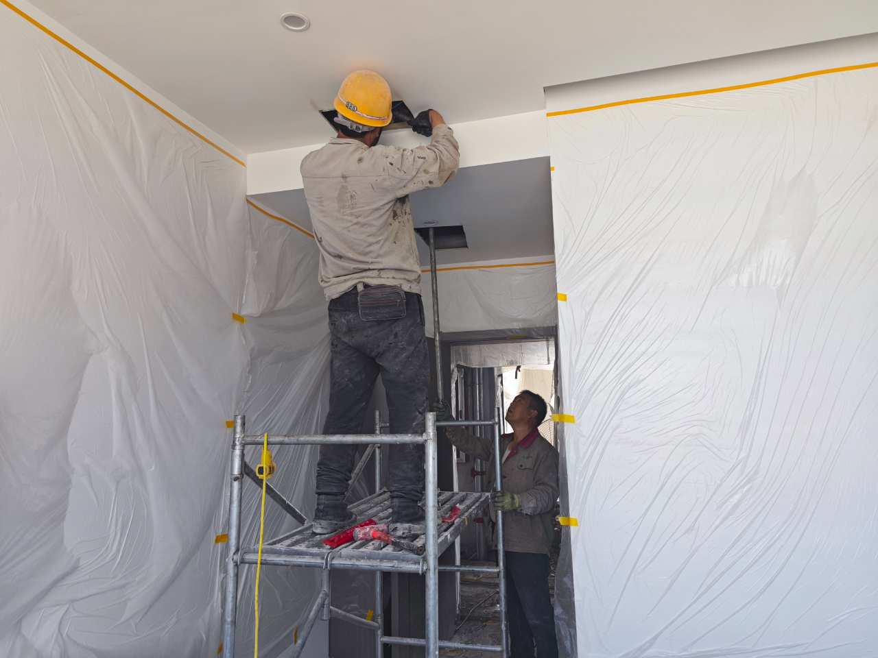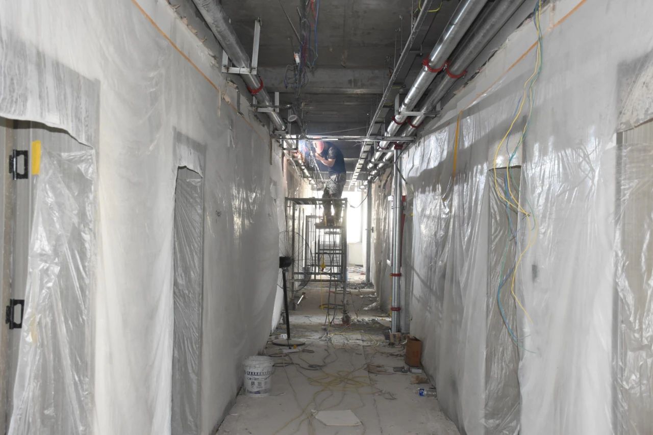 夏日的骄阳下,南赵庄社区养老幸福工程现场一片火热,焊接声、切割声、机器运转的轰鸣声此起彼伏,工人师傅们正在进行消防喷淋系统的安装工作。