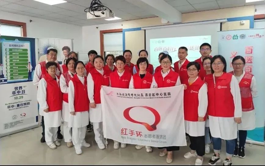 嘉定区中心医院红手环志愿服务团于2016年3月成立,在神经内科主任徐建华的带领以及全院医务人员的支持配合下,以医院神经内科医护为骨干核心力量,依托仁济-嘉定紧密型医联体平台,走村入户广泛开展形式多样的脑卒中防治科普讲座、专家联合义诊咨询、脑卒中高危人群筛查与防治、建立有效双向转诊机制,走进社区居委、社会福利养老院及患者家中送医、送药、送温暖等,积极干预提高卒中患者生活质量,以实际行动践行“坚定执着、无私奉献、守护健康、服务社会”的红手环精神,为百姓健康保驾护航。