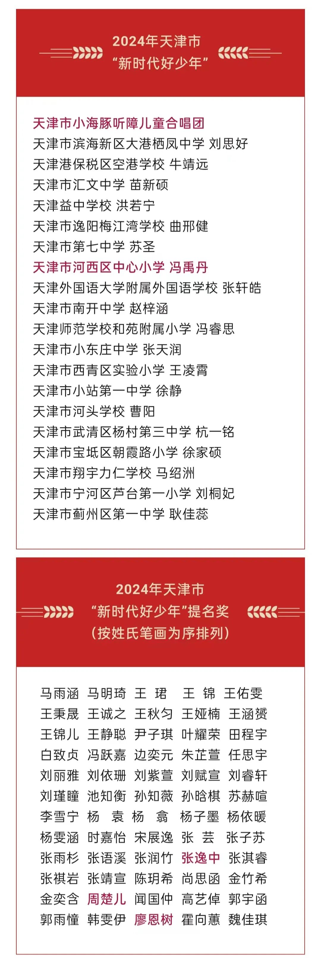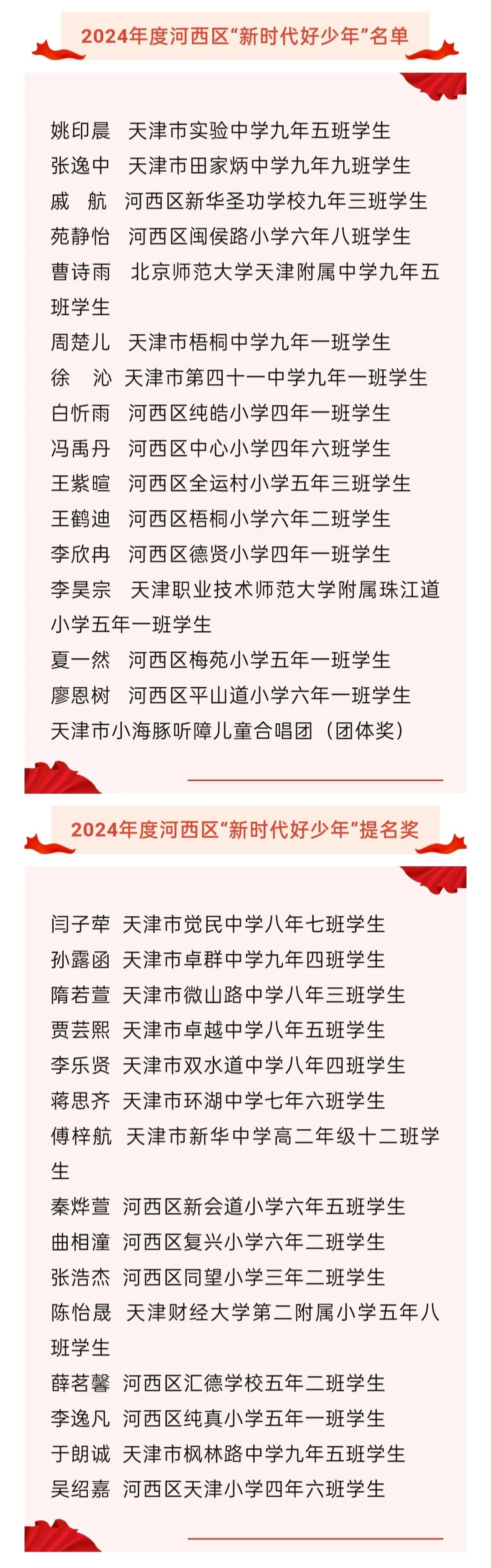 活动为2024年度河西区“新时代好少年”、团体奖和提名奖获得者以及2024年天津市“新时代好少年”和提名奖河西区获得者颁奖。据介绍,2024年度河西区“新时代好少年”获得者共15人、团体奖1个、提名奖获得者15人,河西区1个团体、1名学生入选2024年天津市“新时代好少年”、3名学生入选天津市“新时代好少年”提名奖。他们当中有刻苦学习、勤学善思的小学霸;有热爱体育、驰骋赛场的小健将;有乐于助人、见义勇为的“小雷锋”;还有自强自立、孝亲尊老的少年典范。这些先进典型品学兼优、事迹突出,充分展现了河西区新时代青少年有志向、有梦想,爱学习、爱劳动,懂感恩、懂友善,敢创新、敢奋斗,德智体美劳全面发展的精神风貌。