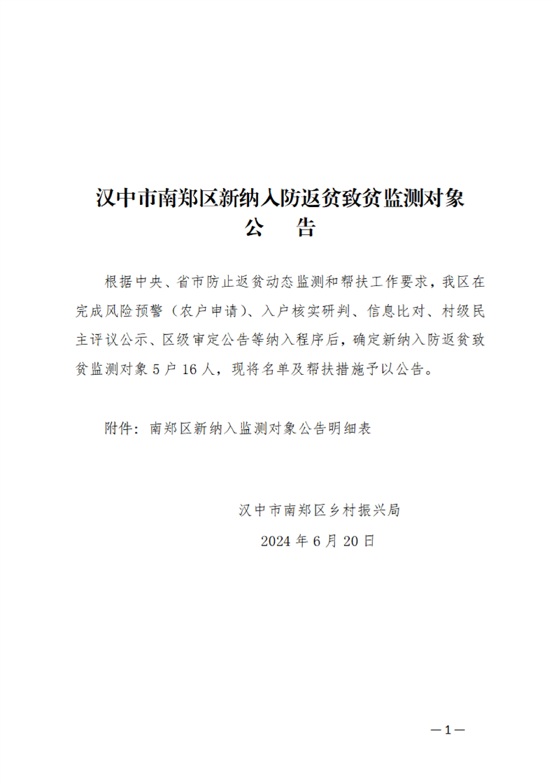 汉中市南郑区新纳入防返贫致贫监测对象公告