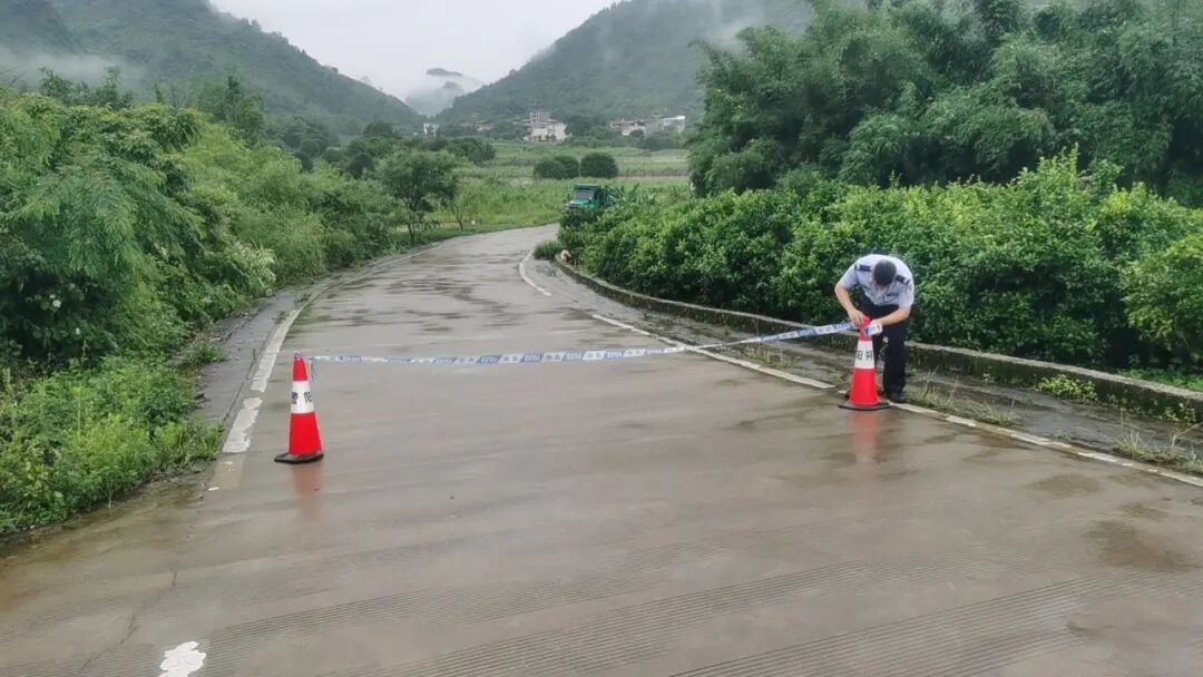 △屏山村莲塘底积水道路无法通行拉警戒线。