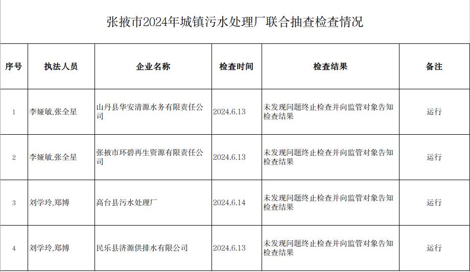 张掖市2024年城镇污水处理厂联合抽查检查情况