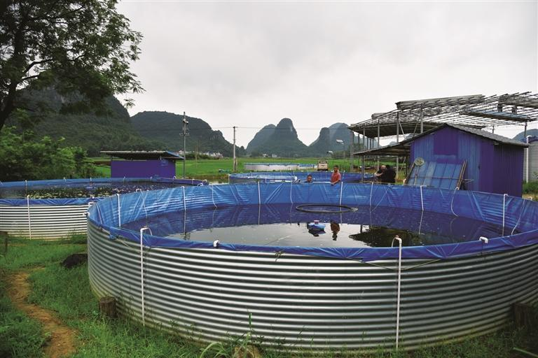 近年来,鹿寨县大力发展陆基圆桶水产养殖模式,以现代化、数字化模式开启渔业智慧养殖,推动传统水产养殖业转型升级,走出一条绿色养殖新路子。据统计,全县目前共有陆基养殖场7个、陆基圆桶高密度养殖池40个,年成鱼产量120吨左右,产值约450万元。
