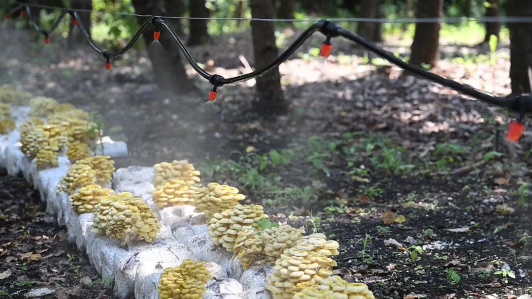陈鹤鸣还告诉小嘉,现在所用的喷淋系统还未完全调试完毕,之后可直连手机操控水量大小、喷水时间等,全程无需农户到场,为接下来扩大种植规模工作打下基础。但现阶段林下菌菇种植主要为采买菌棒后待其发芽出菇,随着规模的不断扩大,成本也会增高,以后将逐步过渡到自行调土育种,探索出一条完全属于自己的林下种植体系。