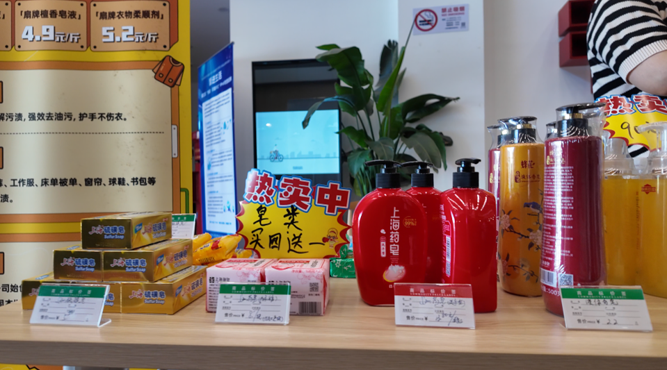 目前这里的“零拷”业务已上线三款经典产品:7.9元一斤的“扇牌重垢无磷洗衣液”,4.9元一斤的“扇牌檀香皂液”,5.2元一斤的“扇牌衣物柔顺剂”。“这款扇牌重垢无磷洗衣液去污能力强,别的地方买不到,只有这个点位上有,洗一些重油污的,甚至是油烟机也可以清洗干净,特别好。”懂行的居民一边买,一边向其他居民介绍。