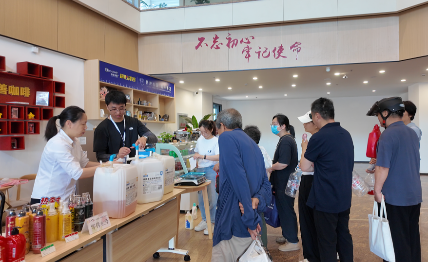 听到有“零拷”,不少阿姨爷叔拎着瓶瓶罐罐,不约而同来到新成我嘉·邻里中心。上汽活动中心“零拷”项目负责人陈佳杰一边帮居民打洗衣液,一边介绍操作流程:“拿自己的瓶子过来,我们先把瓶子的重量去掉,打到需要的量再称重、贴上标签,最后到收银台结账。”