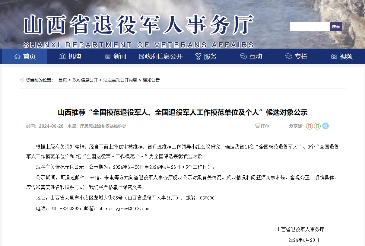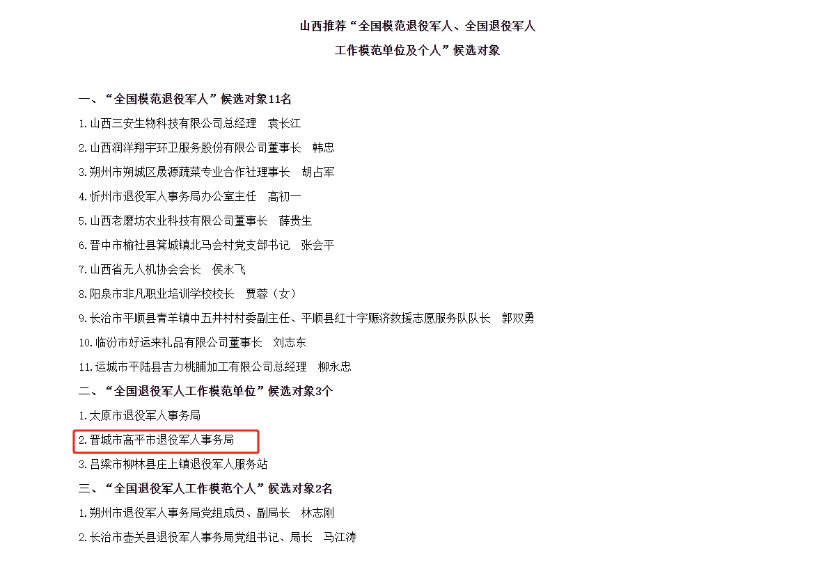 近日,山西省退役军人事务厅发布《山西推荐“全国模范退役军人、全国退役军人工作模范单位及个人”候选对象公示》,其中,我市退役军人事务局被推荐为“全国退役军人工作模范单位”候选对象。