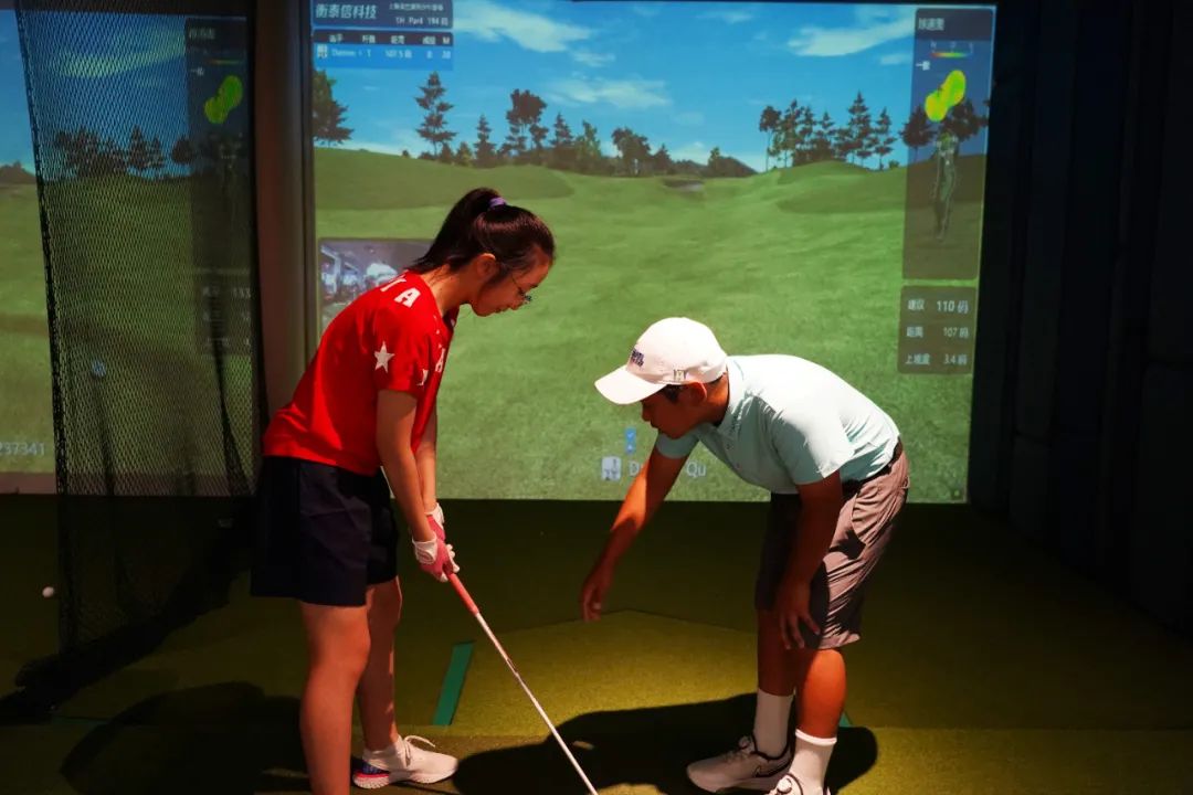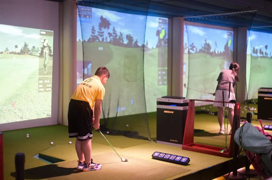 现场,选手们在室内高尔夫模拟机前,计算角度、挥杆击球,幕布上的模拟高尔夫球,则会根据选手的动作进行反馈,落向电脑模拟场地。