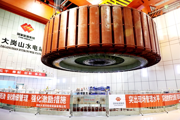 图为大渡河大岗山水电站4号发电机转子吊装现场