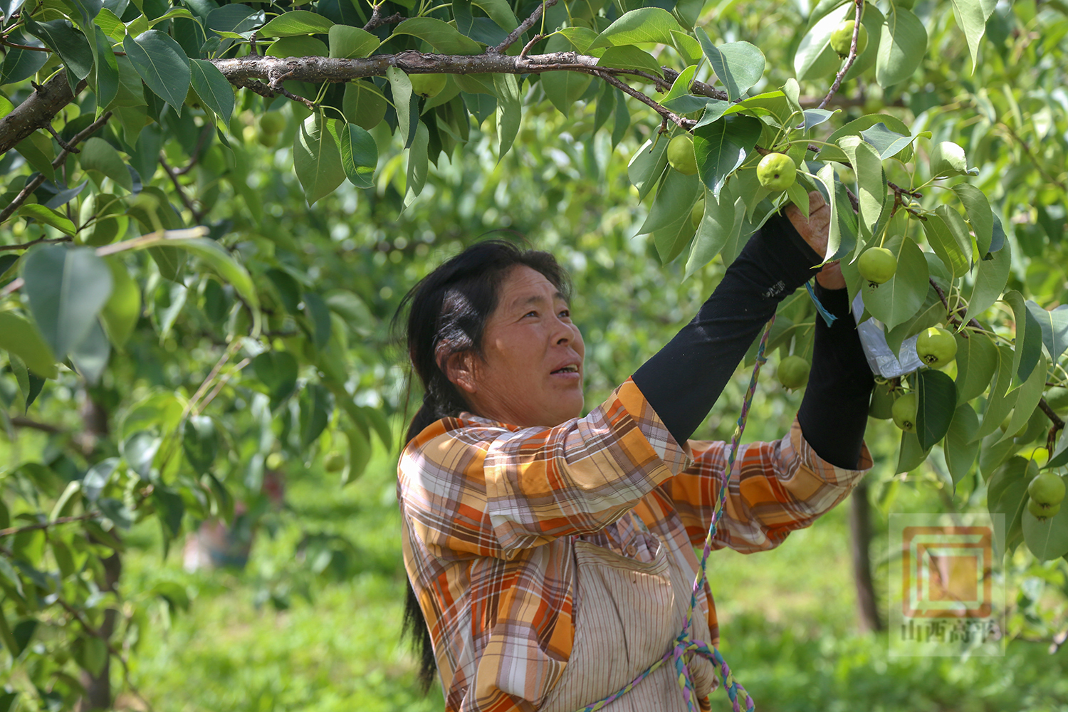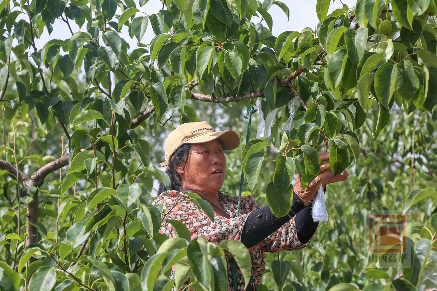 走进梨园里,成片的梨树郁郁葱葱,绿叶间一个个青涩的果实挂满枝头,果农们爬高俯低忙着为梨果套袋,撑袋口、套梨果、扎口袋……动作娴熟、干劲十足。“今年是我在这里干活的第三年了,从梨园开始疏果管护就来了,现在正在给梨套袋子,套的多挣的多,我一天能套7000多个,能挣不少呢!”果农张王兰一边套袋,一边说道。
