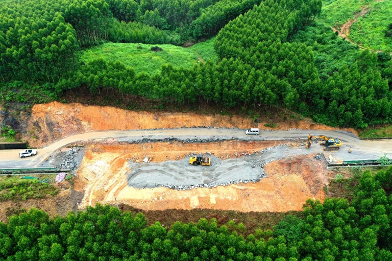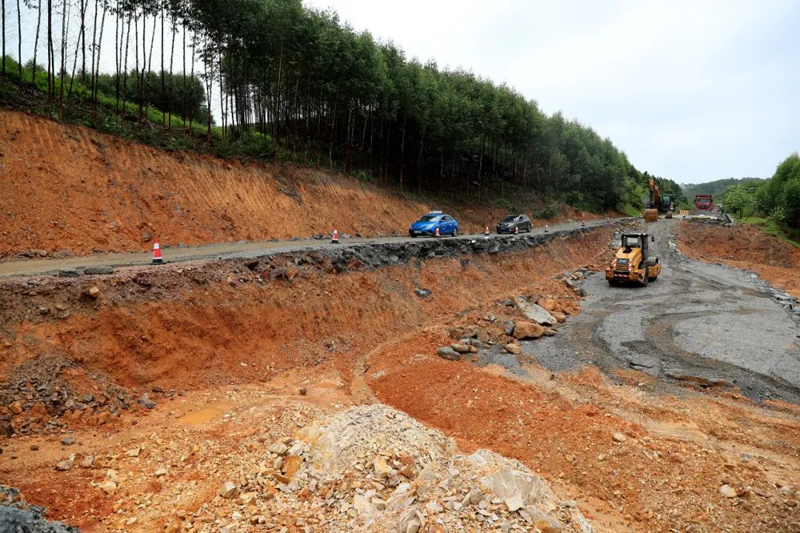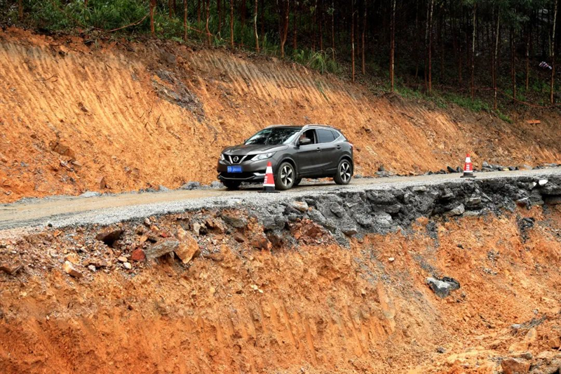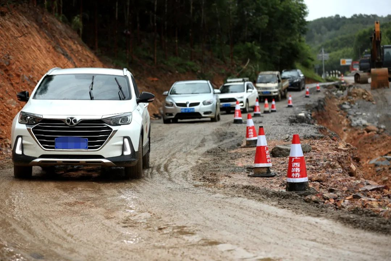 靠近长盛村的路面下沉段已在旁边山坡挖了一条临时便道,车辆能顺利地通过该路段。