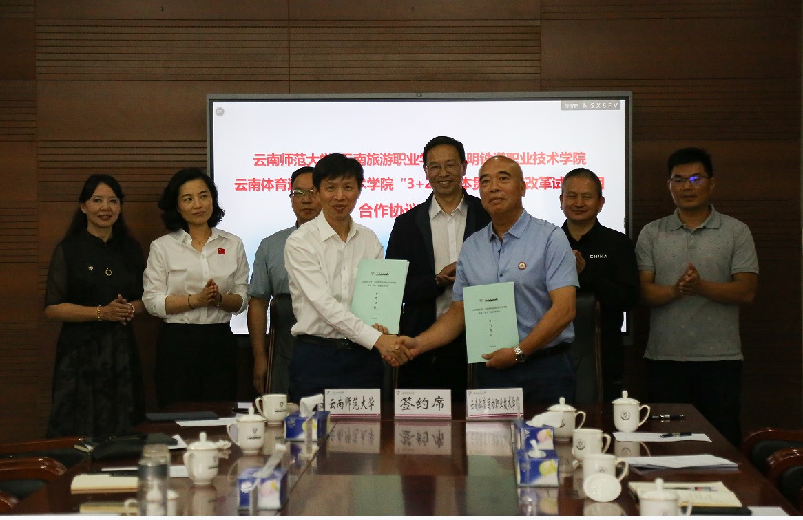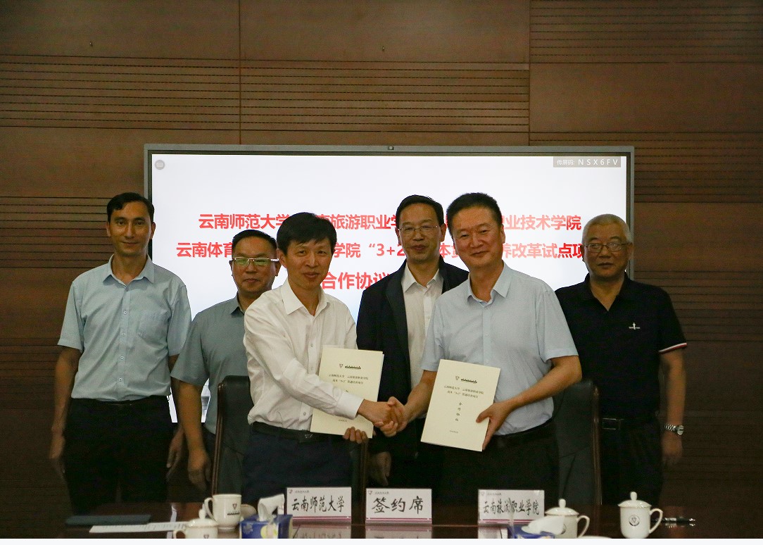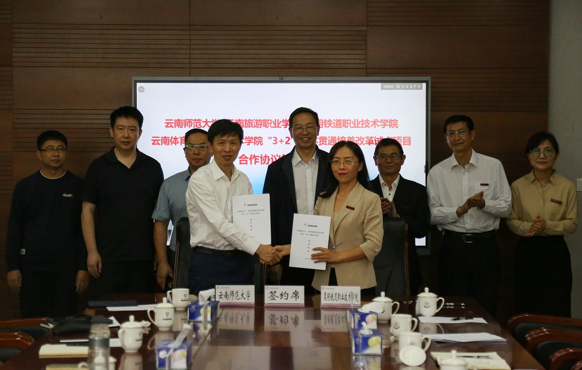 6月28日上午,我校与云南旅游职业学院、昆明铁道职业技术学院、云南体育运动职业技术学院高本“3+2”贯通培养项目合作协议签订仪式在呈贡校区行政楼会议室举行。校长胡金明、副校长陈正权,教务处、学生处、职业技术教育学院、物理与电子信息学院、体育学院主要负责人,云南旅游职业技术学院、昆明铁道职业技术学院、云南体育运动职业学院主要负责人参加了签约仪式。