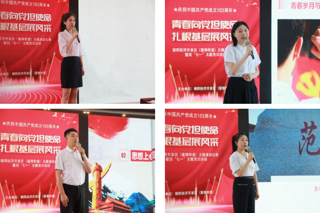 为庆祝中国共产党成立103周年,朝阳经济开发区(富锋街道)党工委组织2023年新入职干部开展主题演讲比赛,全面展示青年干部忠诚干净担当的精神面貌。