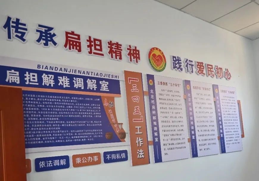 三甲镇北庄村的“扁担解难调解室”探索了“亲人、亲民、亲情、亲自”的“四亲形式”工作法。