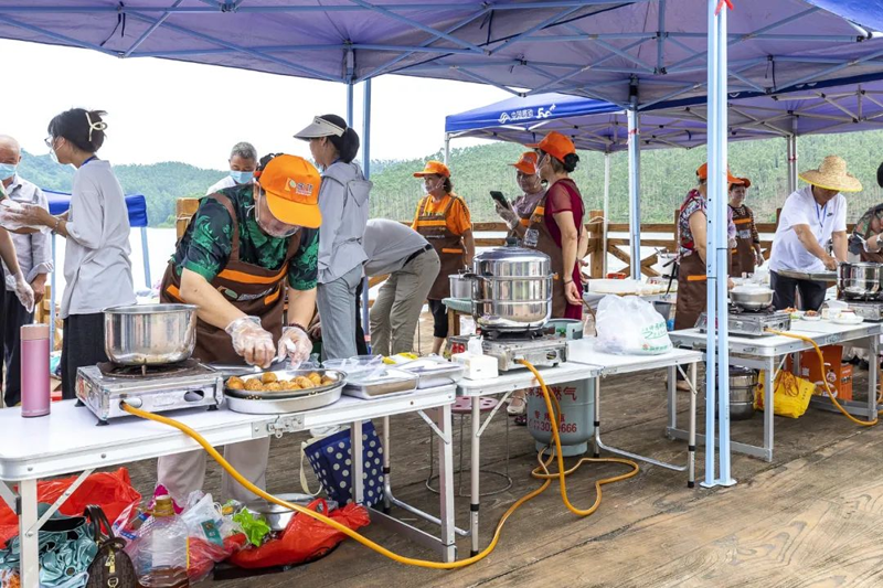 而在美丽的龙母湖畔,“赞辉煌成就·享健康生活”美食大比拼活动热闹非凡,县老年大学厨艺班的10名参赛选手们大显身手,一道道精美的美食小吃让人垂涎欲滴。选手们在弘扬中华美食文化的同时,尽情展现了健康生活方式的魅力。