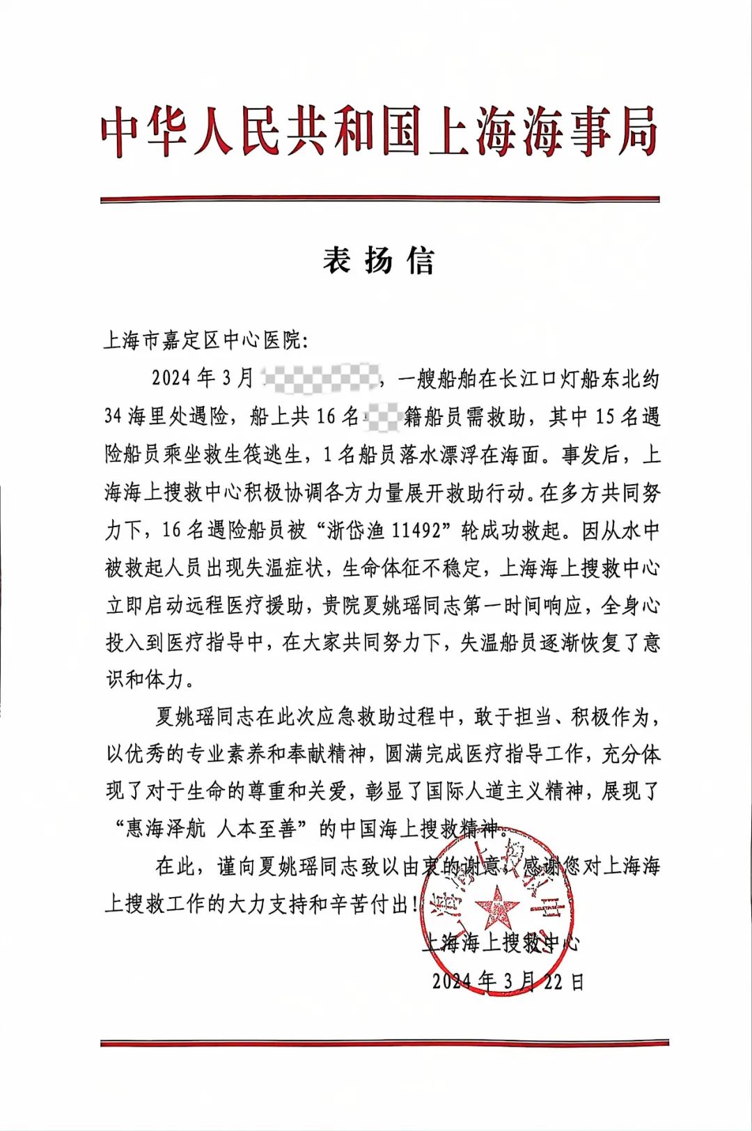 搜救中心立即启动远程医疗救助,联系到上海海上搜救医疗专家组成员——仁济医院嘉定分院(嘉定区中心医院)的护士夏姚瑶。