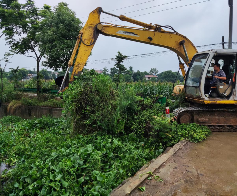 作业现场,机械的轰鸣声打破了雨幕的沉寂。挖掘机在抢险队员的熟练操作下,有条不紊地进行着作业。沟渠中的杂草、淤泥和杂物被一一清除,水流逐渐变得通畅,水位也得到了有效控制。
