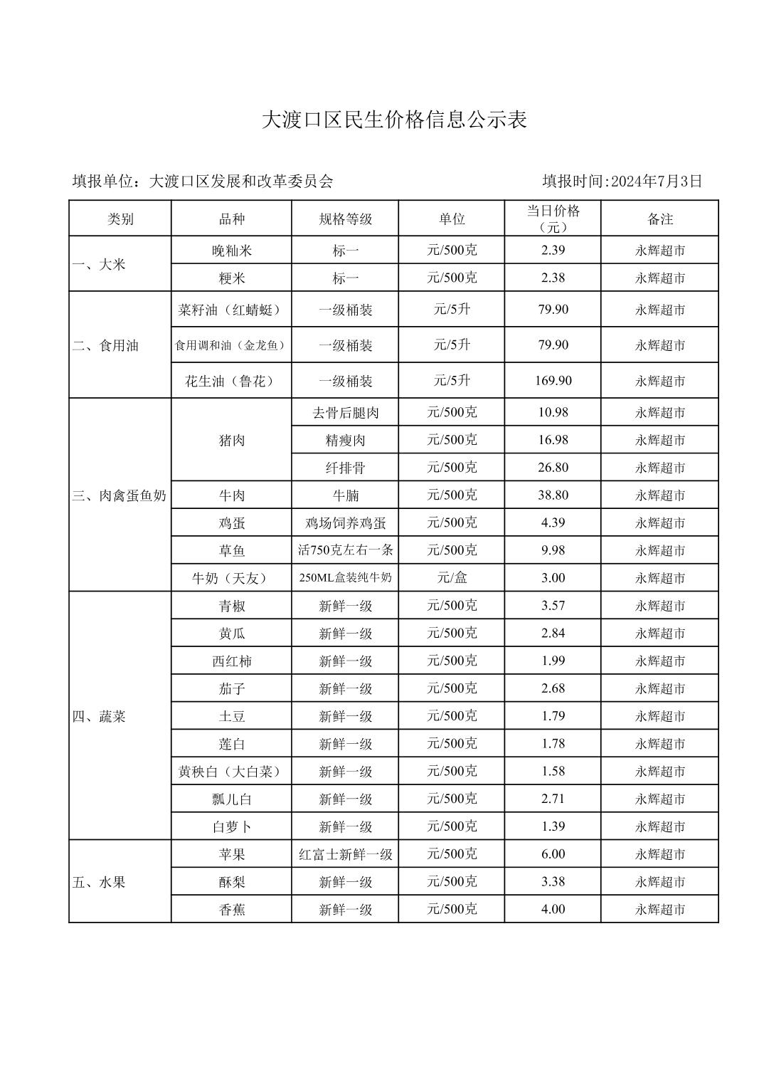 大渡口区民生价格信息公示表 2024-7-3