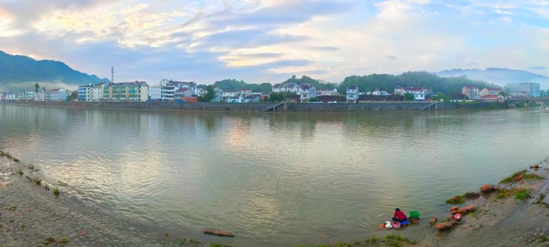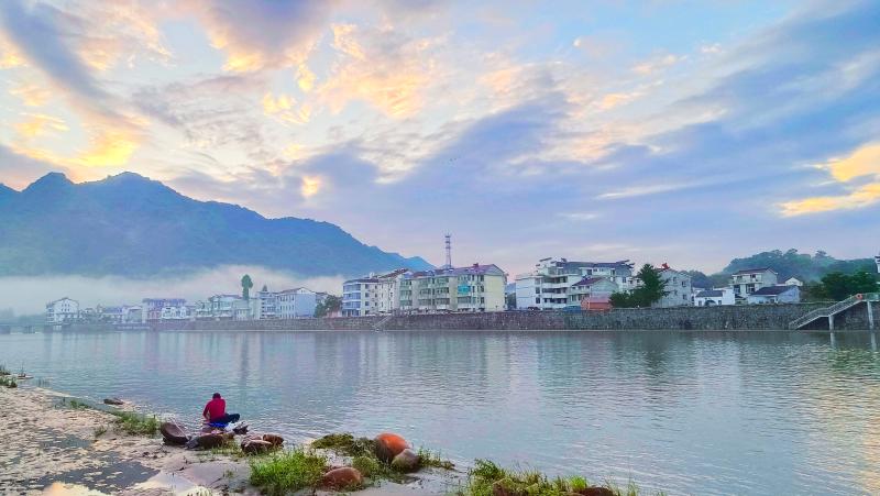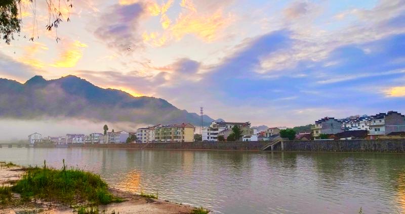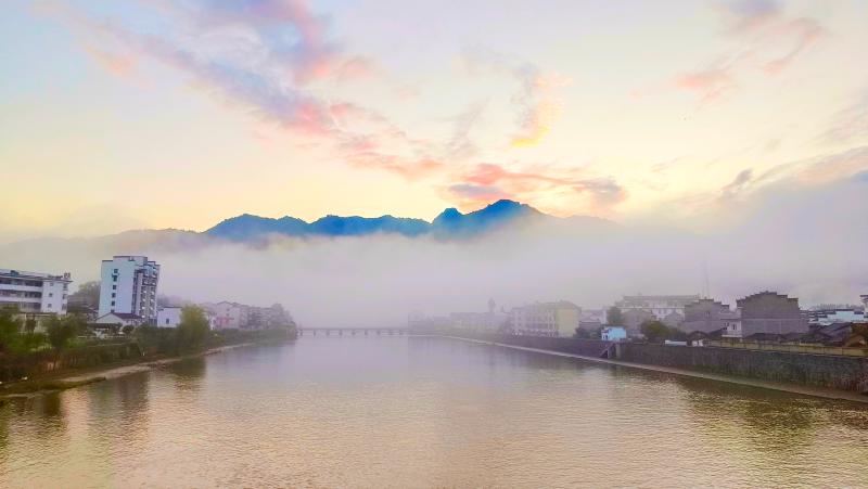 7月3日晨,在舒城县西南山区晓天镇,晓天河畔雾气缭绕,霞光灿烂,波光潋滟,宛若画卷。(丁文新)