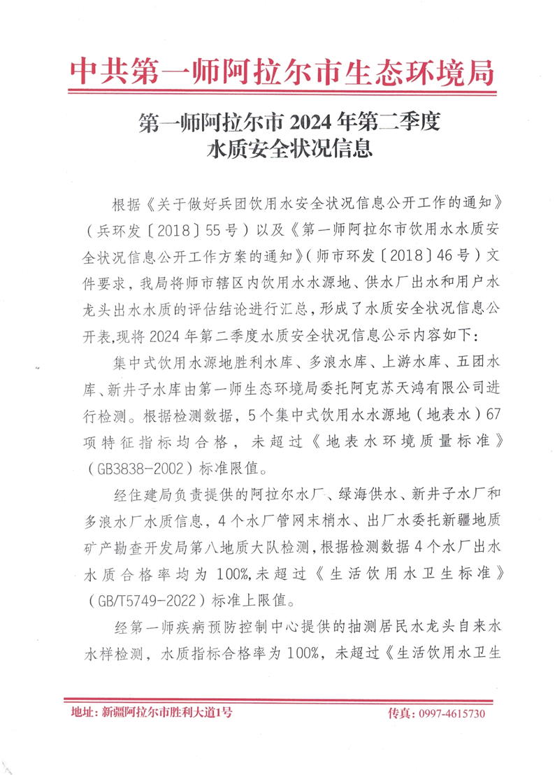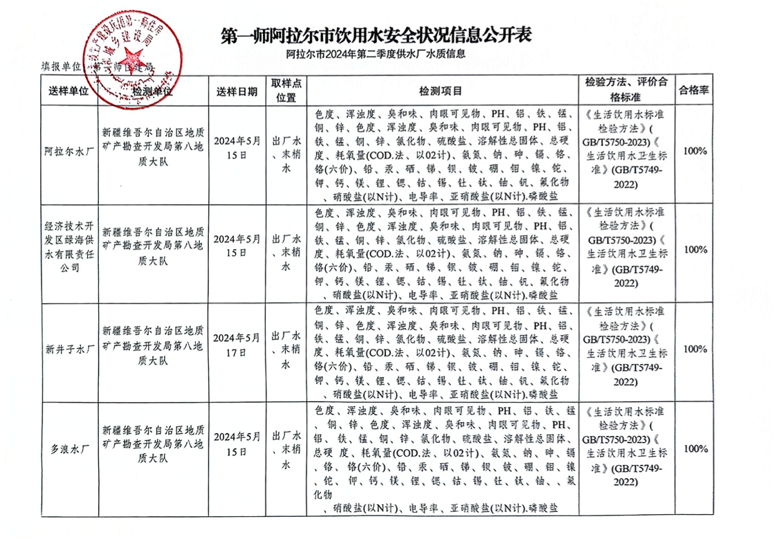 第一师阿拉尔市2024年第二季度水质安全状况信息