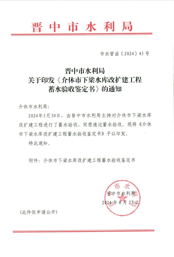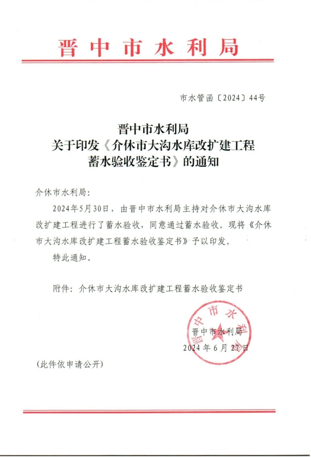 6月27日,介休市下梁、大沟水库改扩建工程,经晋中市水利局、介休市水利局等多部门联合进行蓄水验收,一次通过,验收合格!
