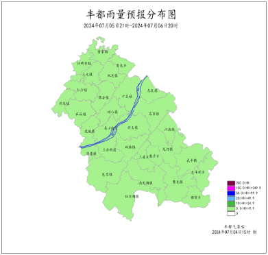 2024年7月3日16时至7月4日16时我县阴天有阵雨。最大降雨量为9.2mm(龙孔)。极大风速12.4米/秒(武平峰子山,3日18时),最低气温17.1~24.5℃,最高气温18.4~33.9℃。丰都国家基本站雨量2.3mm,最低气温23.6℃,最高气温29.8℃。