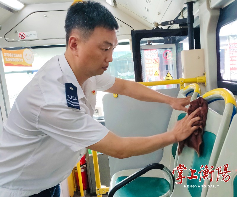 7月1日上午,记者赶到船山大桥公交枢纽站场,半小时的采访过程中,记者发现,刘念文一直没有歇过,细致擦拭车厢扶手、座椅,打开车辆尾厢盖,观察输电线路是否松动……