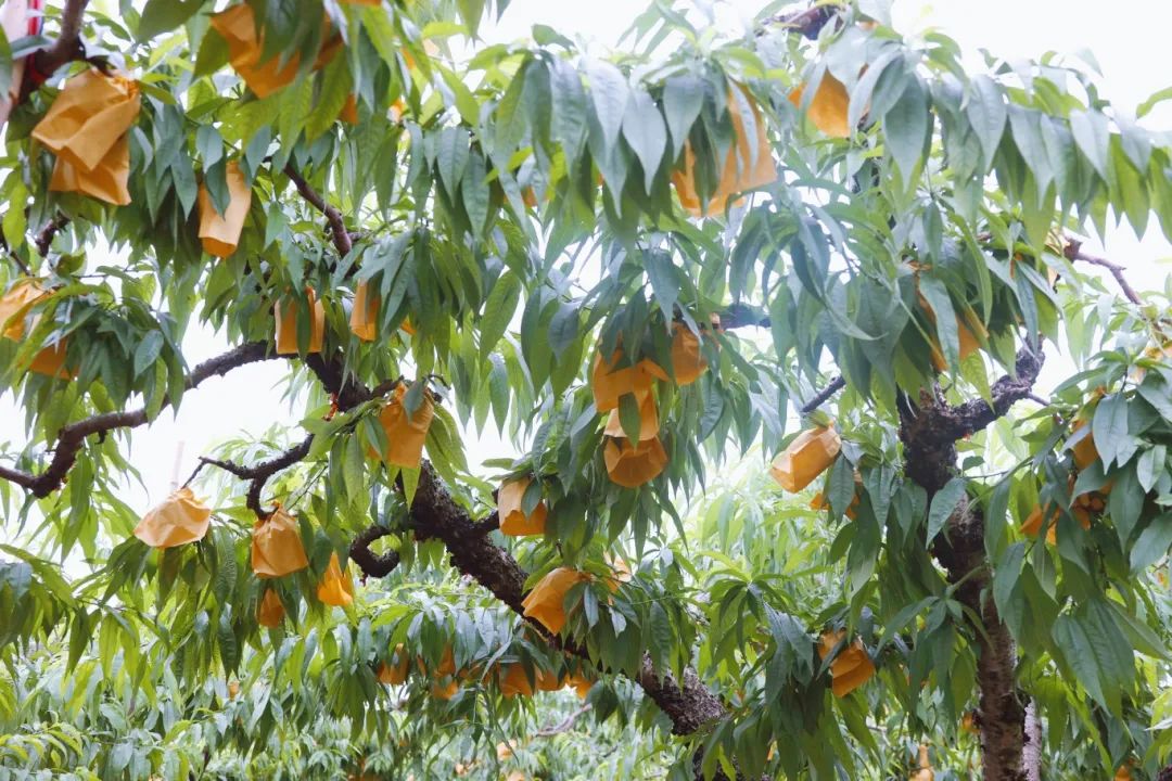 走入位于外冈镇巨门村的锦绣桃园内,清新的桃香弥漫开来,桃树整齐排列,微微被压弯的枝条间,挂满了一个个被黄色纸袋精心包裹的“小胖纸”。果农们身影忙碌,穿梭在郁郁葱葱的桃林间,采收着成熟的桃子。