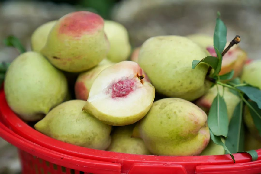 六合村的鹰嘴桃因尾部酷似“老鹰嘴巴”而得名,采收期为20多天,果实色泽青白泛红,蜜甜多汁、肉质爽脆,是不可多得的水果精品。