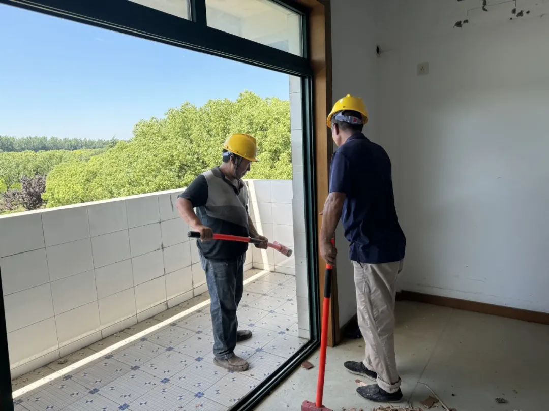 施工现场,工人们各司其职,有条不紊地移除旧设施。“为了尽量减少对在住老人的影响,我们将施工区域与老人居住区域隔离开,并严格控制施工时间,施工时间为6:00-11:00和13:00-18:00。”项目现场负责人杨必华介绍,项目工期120天,预计今年10月中旬竣工交付。